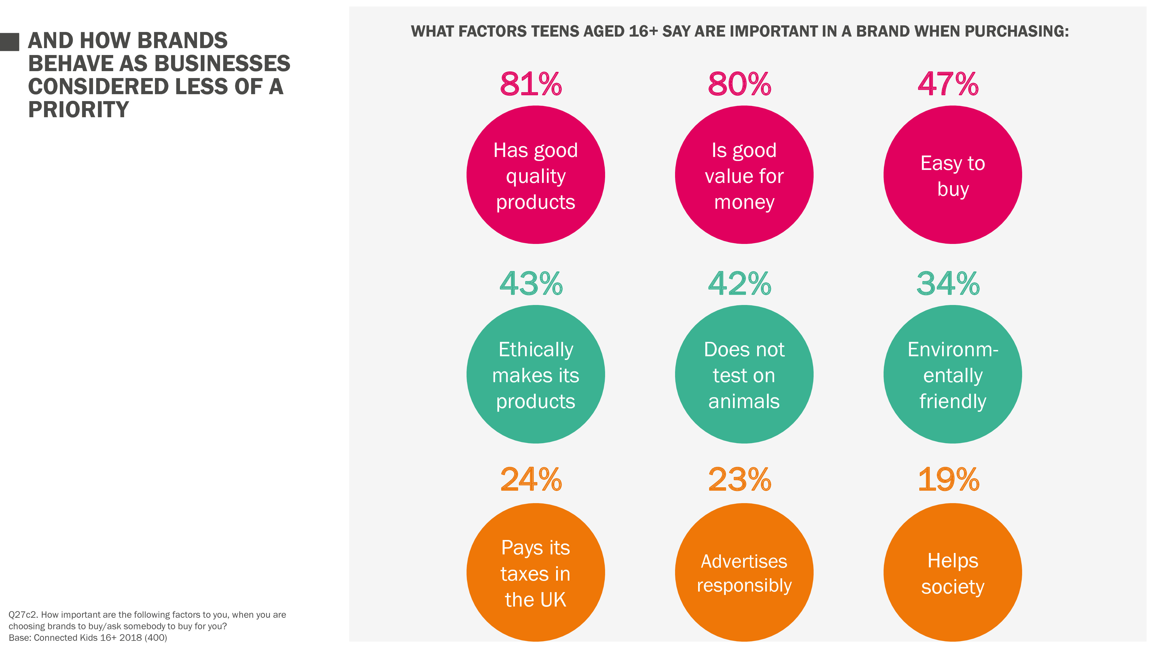虽然青少年比成年人更有可能为支持相关事业或慈善机构的品牌支付额外费用,但他们仍将质量(81%)和价值(80%)置于道德因素之前,例如,产品是如何制造的(43%),它是否在动物身上进行了测试(42%),是否环保(34%)。