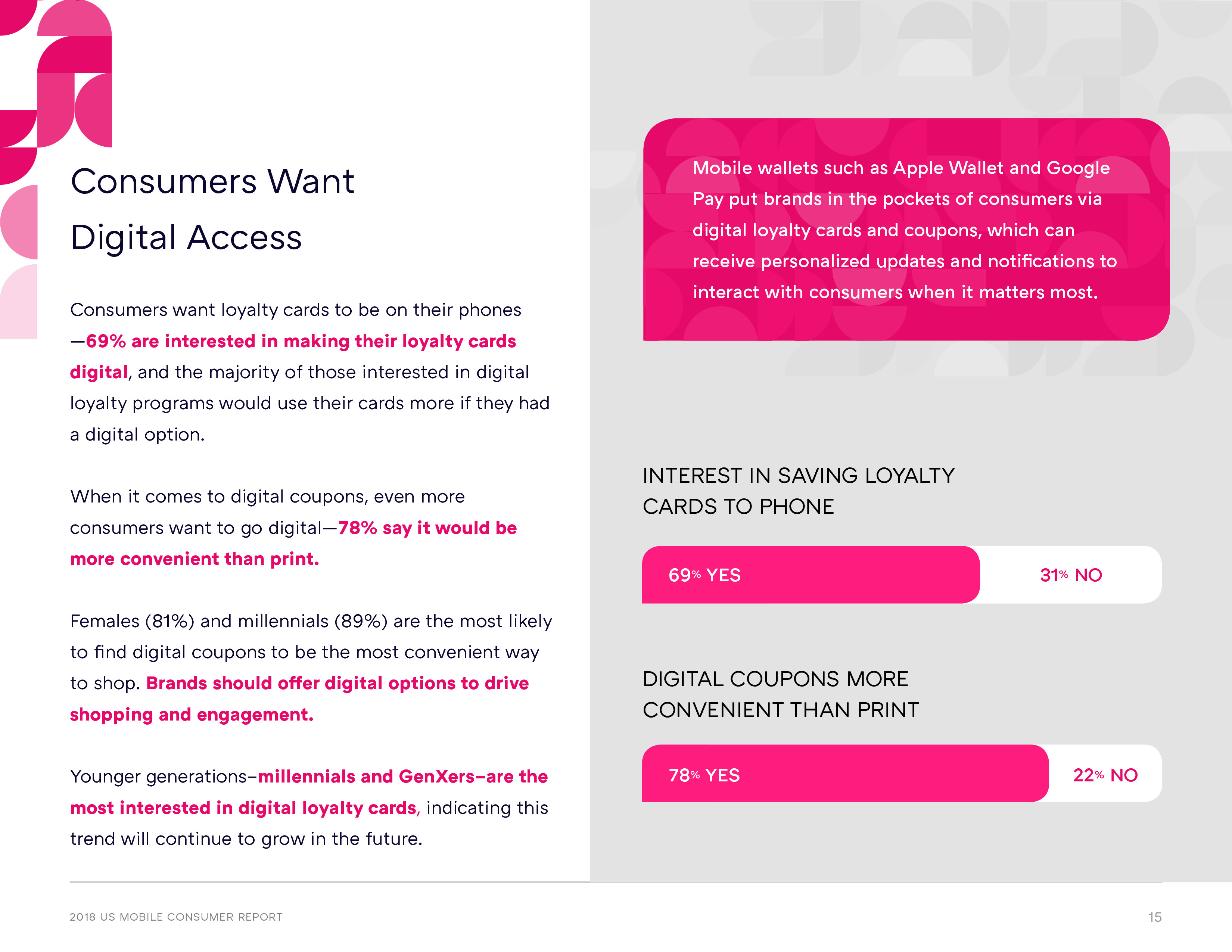 但是,手机钱包的功能不仅仅是交易。除了促销和优惠券,手机钱包使用的第二大动力是提供更有效的省钱方式。换句话说,许多人愿意尝试手机钱包,并通过组合优惠券、会员卡和航空公司登机牌等方式让他们的生活变得更轻松。调查还发现,手机钱包用户对将积分卡存入手机也有强烈的兴趣,69%的受访者这么说。换句话说,手机钱包的组合能力对吸引消费者非常有效。