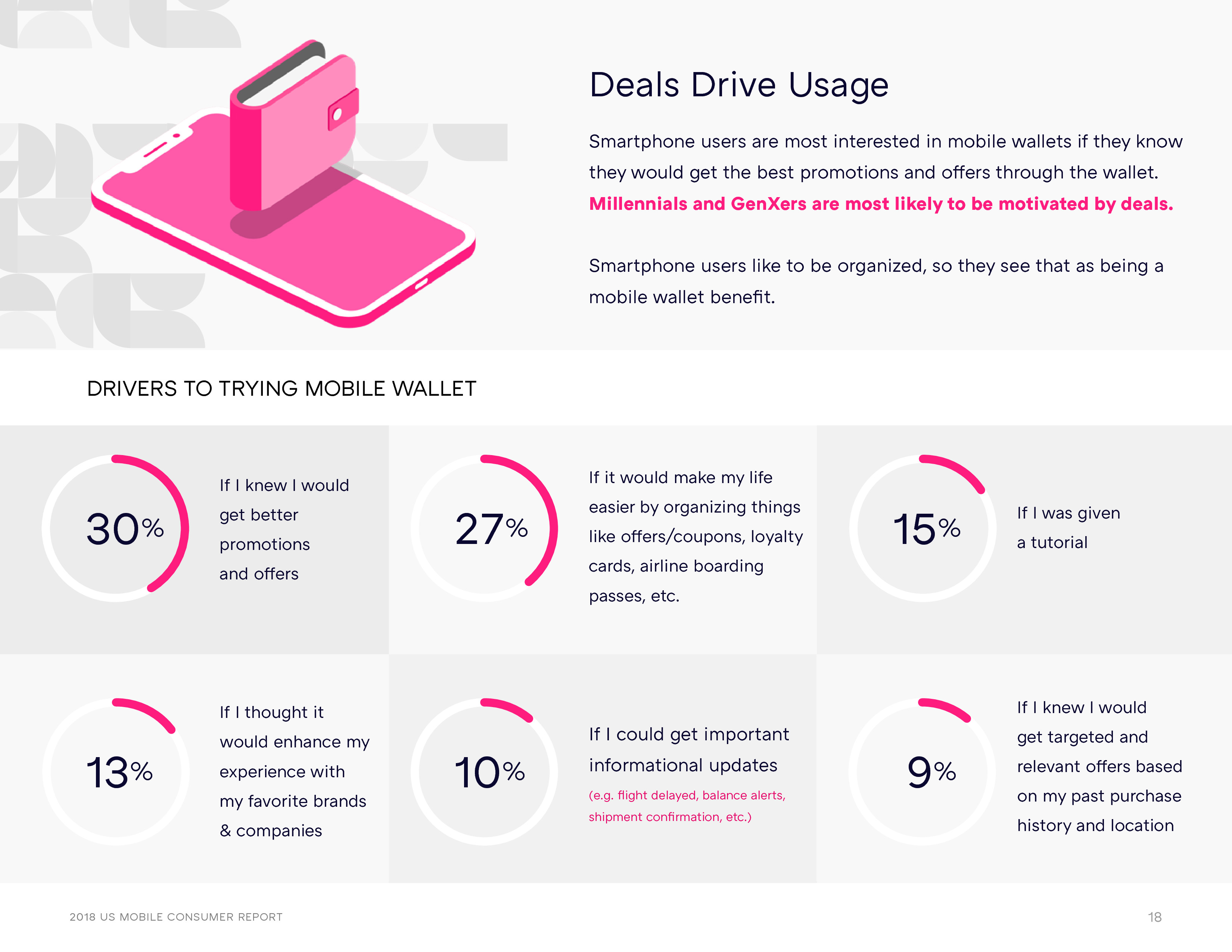 使用手机钱包的最大驱动因素是获得更好的促销或优惠。这一调查结果和几年前比并没有太大变化:智能手机用户一直表示搜索和兑换优惠券是手机钱包最有趣的用例。