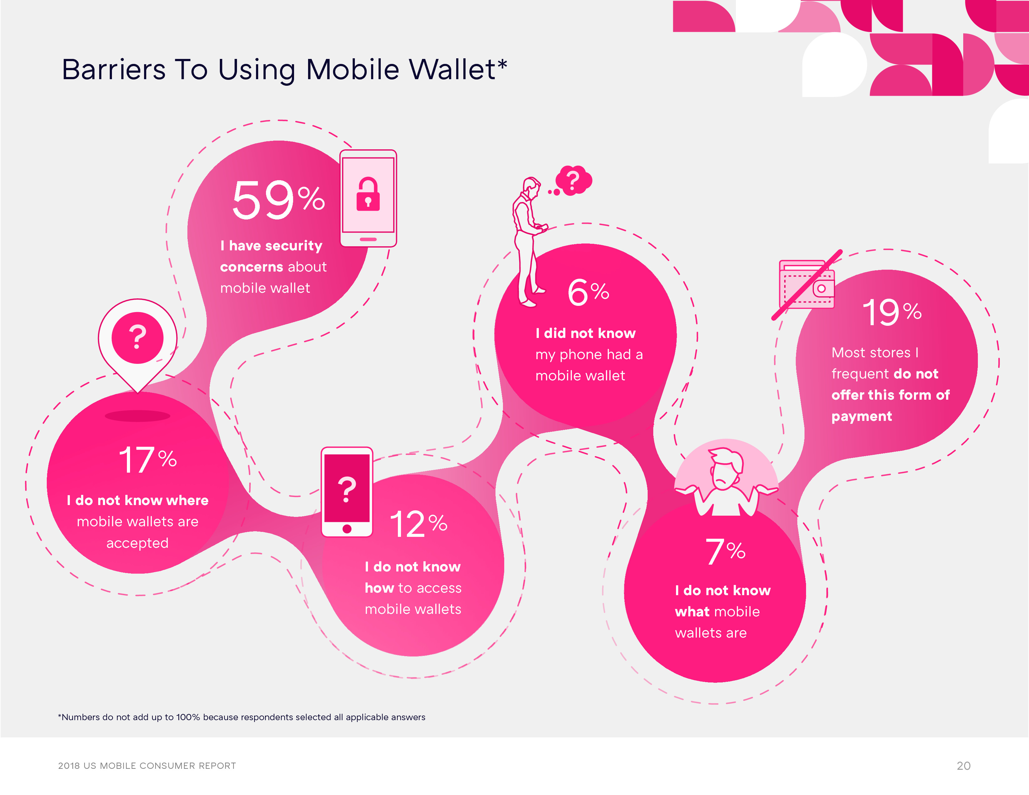 但是,最重要的一个因素是安全问题。59%的受访者表示安全问题是使用手机钱包的障碍,远远高于其他因素,如缺少商店支出选项的支持(19%),以及不了解如何安装和使用手机钱包(12%)等。