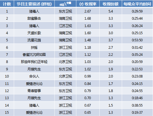 本月,湖南卫视整体呈现较明显的优势,占据冠军席位,日均收视整体高于其余卫视频道,卫视晚间剧场排名在TOP5中占据3席,新闻节目占据TOP3,综艺节目在TOP7中占据5席。江苏卫视凭借收视表现较好的剧目《猎毒人》、《香蜜沉沉烬如霜》及综艺节目《非诚勿扰》在晚间排名上升至第2。浙江卫视晚间收视排名第3,综艺节目《中国好声音Ⅲ》排名TOP1。