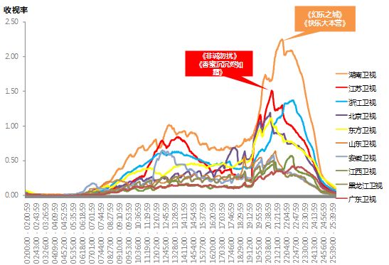 观察各大卫视全天收视曲线,收视峰值较7月略有下降。湖南卫视于20:30左右迎来晚间第一个收视小高峰。东方卫视晚间收视曲线与湖南卫视接近。白天中午时段均有明显的小高峰,晚间收视峰值早于湖南卫视,出现在21:00左右。这得益于《中国好声音Ⅲ》的播出,本月晚间浙江卫视在22:00后收视仅次于湖南卫视,于22:30左右达到收视高峰。