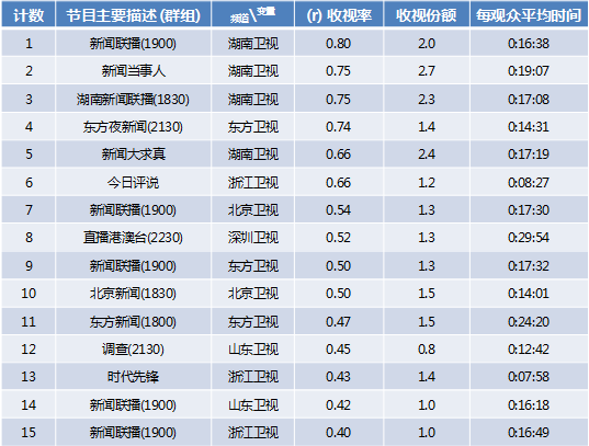 各卫视新闻节目收视普遍相对偏低。从排名看,排名前三均为湖南卫视播出的新闻节目。湖南卫视19点档《新闻联播》排名第一,其次为《新闻当事人》,《湖南新闻联播》排名第三。