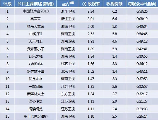 从综艺节目排名来看,TOP7被浙江卫视和湖南卫视“承包”。浙江卫视《中国好声音Ⅲ》位居榜首,其衍生节目《真声音》排名第2。榜单第4至第7名均为湖南卫视节目。收视率上,湖南卫视《快乐大本营》及《中餐厅Ⅱ》8月收视均突破2。北京卫视《跨界歌王Ⅲ》进入前10,东方卫视《新舞林大会》排名第12。江苏卫视《非诚勿扰》进入前10,江苏卫视季播综艺节目《一站到底》、《匠心传奇》及《阅读阅美》均进入前15。