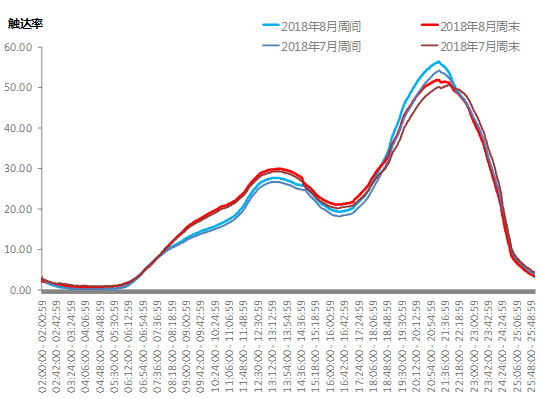 整体收视表现上,8月周末白天触达高于周间,周间晚间触达高于周末,电视整体触达高峰在19点-23点间,收视跨度大,且触达率超过50%,触达高峰较7月有所上升。