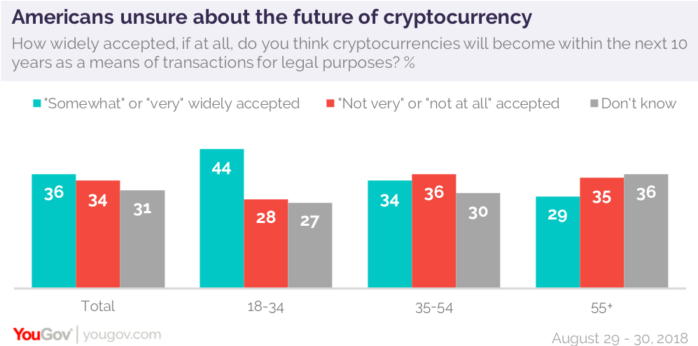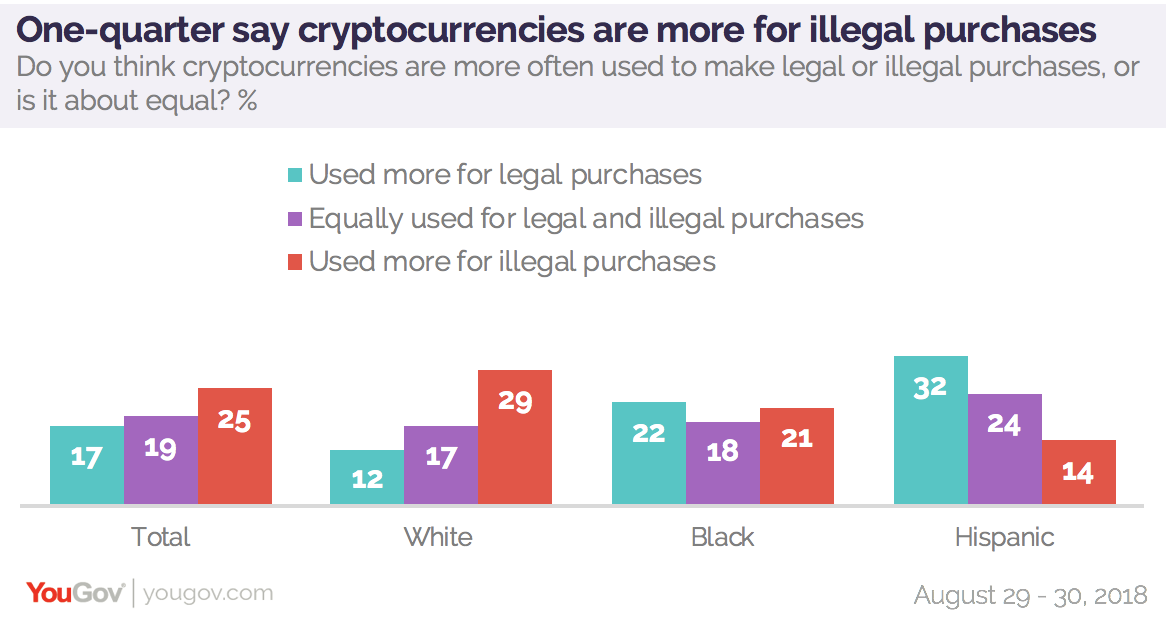 34%的美国人不认为加密货币在十年内被广泛接受,这可能与人们认为加密货币通常用于非法交易。25%的受访者认为加密货币更多地用于非法交易。只有17%的受访者认为其更多地用于合法交易。