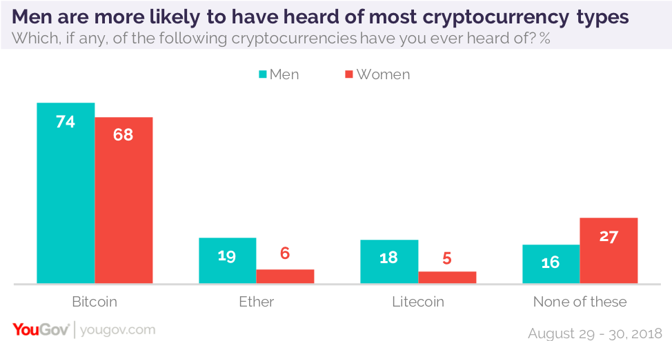 到目前为止,美国人中最着名的加密货币是比特币,71%的受访者说他们已经听说过。其次是Ether / Ethereum,只有13%的美国人听说过。总体而言,男性比女性更有可能听说过几乎所有类型的加密货币。大约3/10的女性(27%)表示她们没有听说过任何加密货币,相比之下只有16%的男性这么表示。
