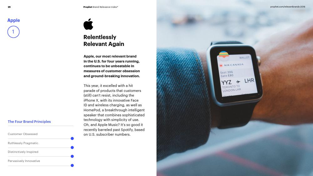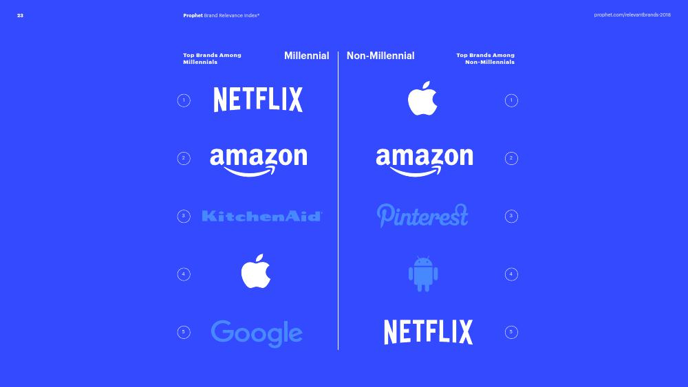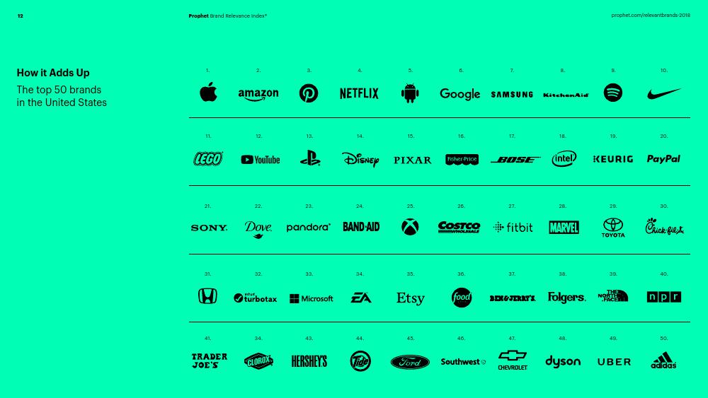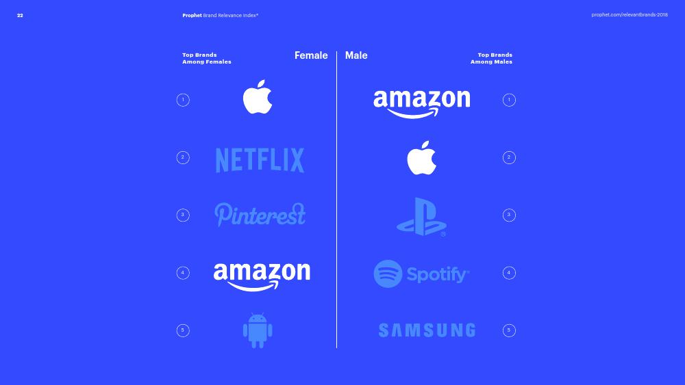 今年的排行中,苹果位居榜首,连续3年位居第一。亚马逊、Pinterest、Netflix、安卓、谷歌、KitchenAid、Spotify、耐克跻身前十。亚洲企业中仅次于三星的日本索尼排行第21位,丰田和本田分别排第29和第31。