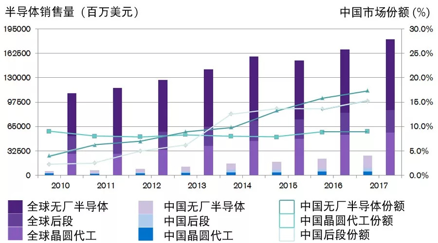 根据世界半导体贸易统计(WSTS)的数据显示,全球32%的半导体销往中国市场,使之成为全球最大的半导体行业消费国。WSTS预测全球半导体市场在2018年将按年上升15.7%,达到4,771亿美元的规模。按此推算,中国半导体市场是一个达到1,500亿美元规模的巨大市场。