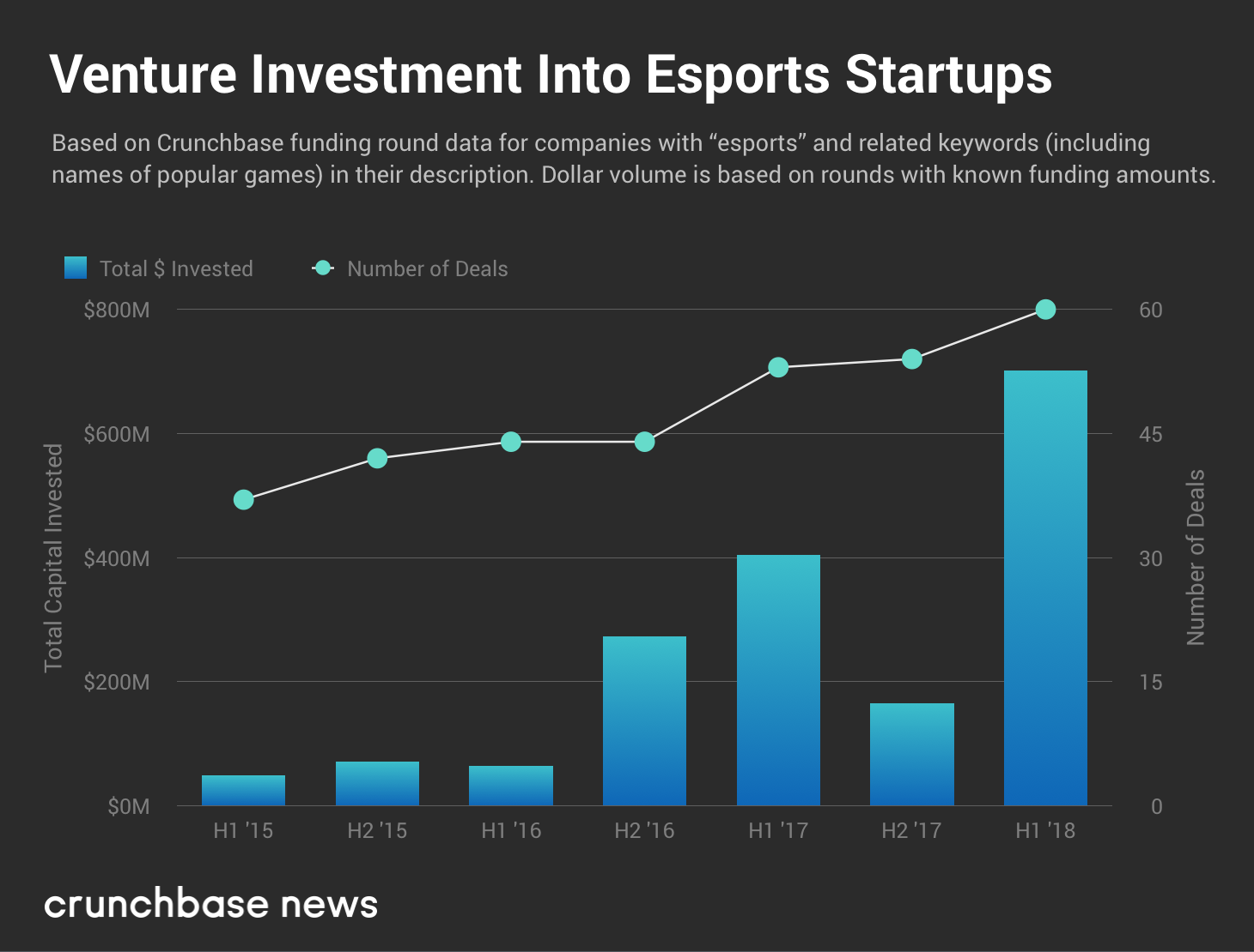 根据Crunchbase的数据,2018年上半年专业竞技视频游戏完成60宗交易,共获得7.01亿美元投资。与2017年上半年获得4.037亿美元(53宗交易)相比,增长了73%。