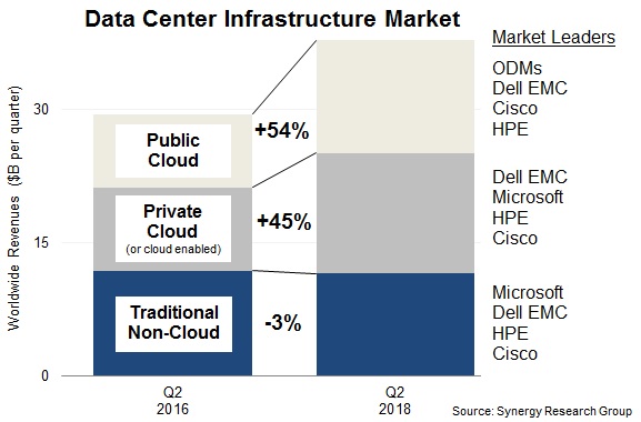 Synergy Research Group发布的第二季度数据显示,过去24个月数据中心硬件和软件的季度支出增长了28%,这主要得益于对云服务的需求不断增长以及全功能服务器的价格上涨。主要受益者是提供公共云基础设施的供应商,他们在此期间的收入增长了54%。