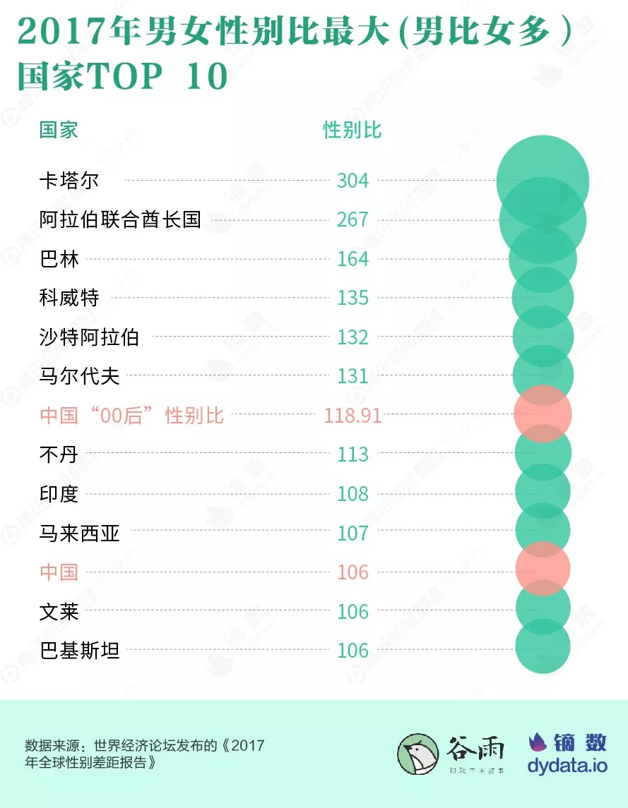 根据世界经济论坛发布的《2017年全球性别差距报告》,如果把”00后”看做一个国家,凭借118.91的性别比,它将仅次于马尔代夫,成为男女性别比差异第七大(男多女少)的国家。