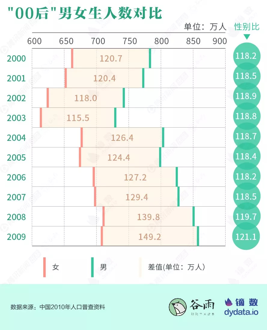 刚刚迈入大学的第一批”00后”即将在两年后达了合法结婚的年纪,但同时也面临着严重的性别失衡问题。根据国家2010年第六次人口普查年鉴(以下简称”六普”)数据显示,”00后”(2000-2009年出生)男生比女生多出了近1271万,整体人口的性别比达到了118.91。
