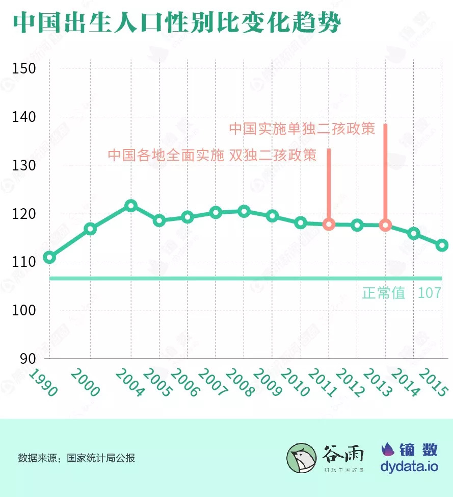 1982年,三普时我国出生人口性别比是108.47,略微超过正常值,1990年第四次人口普查时达到了111,2000年11月第五次人口普查时我国新生儿出生性别比已高达116.9,并在2004年达到峰值121.18,严重偏离正常范围。