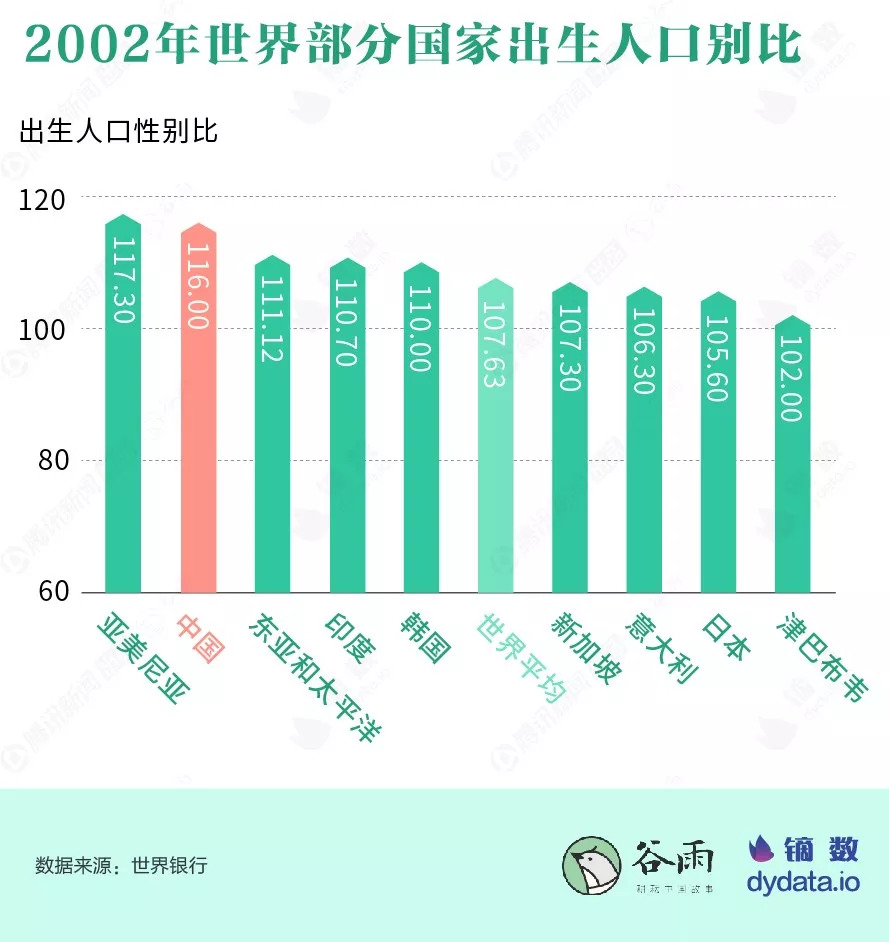 进一步分析数据可以发现,在公布数据的192个国家和地区中,2002年出生人口性别比属于正常值102-107共计180个国家,超过107只有12个国家,其中中国排名第三。