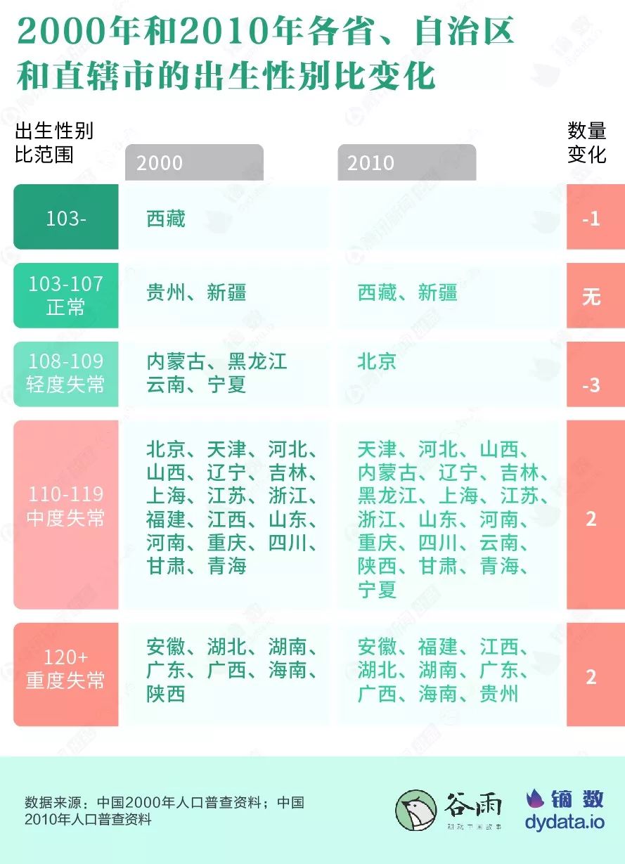 聚焦到各省份情况,在”00后”出生的10年间,出生比中、重度失衡的省份数量增加了4个。