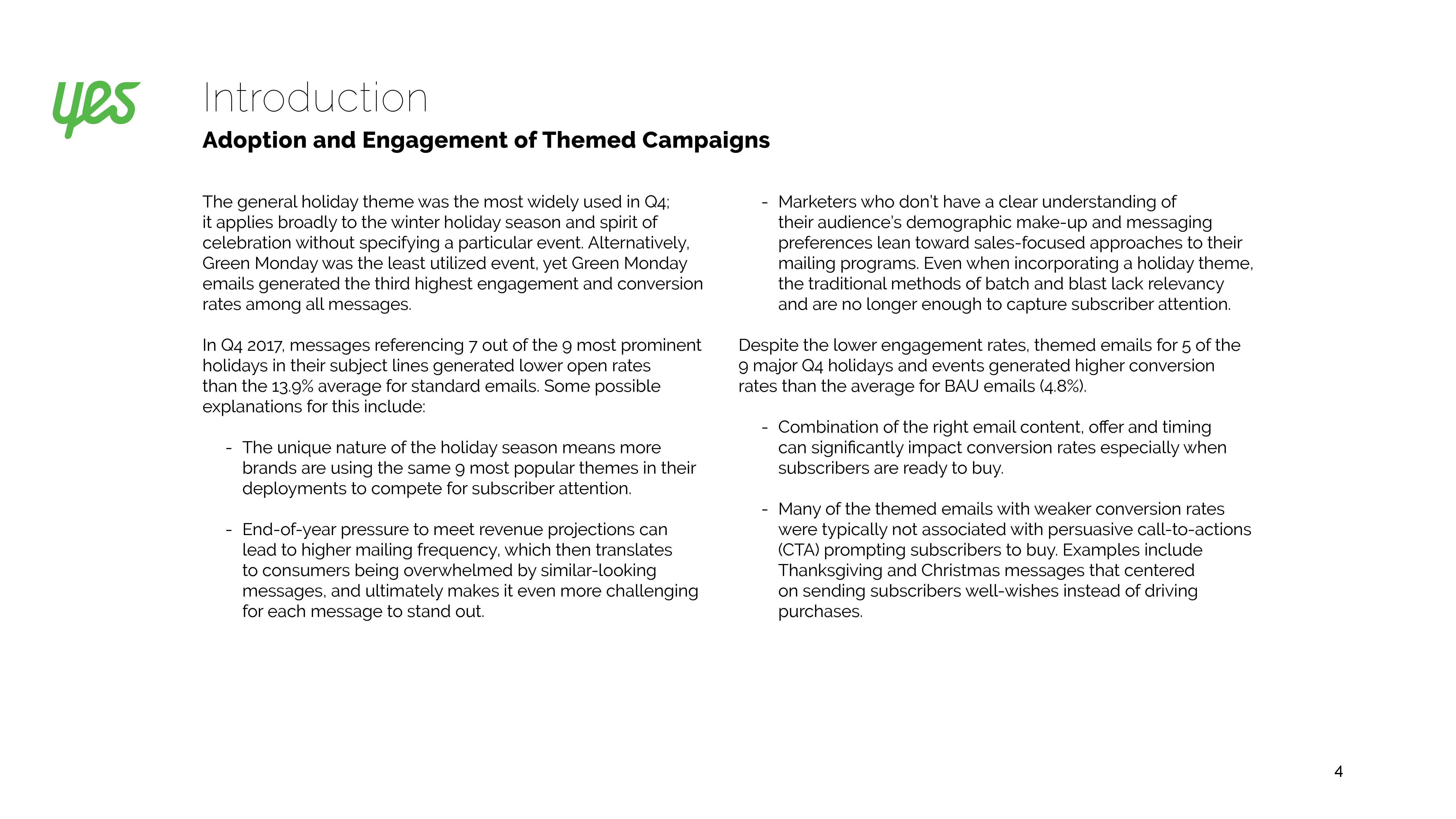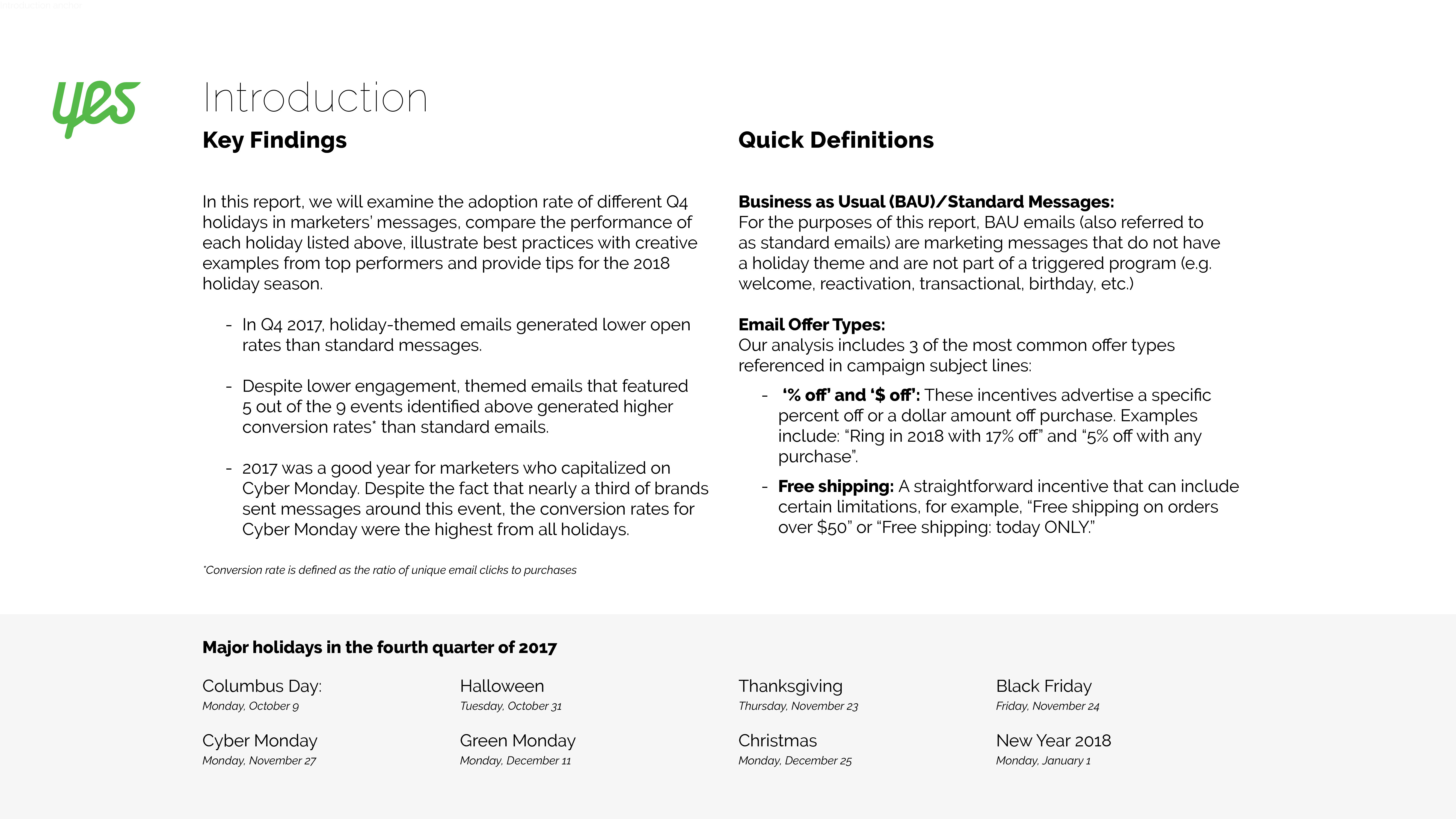 分析师估计2018年假日购物季增长较为温和,零售电子商务增长15.3%,假日购物零售销售总额增长3.8%。对品牌来说,最重要的就是制定假日购物季营销策略。因此,Yes Lifecycle Marketing分析了2017年第四季度的80亿封电子邮件,以了解标准电子邮件指标,参与度和转化率等。