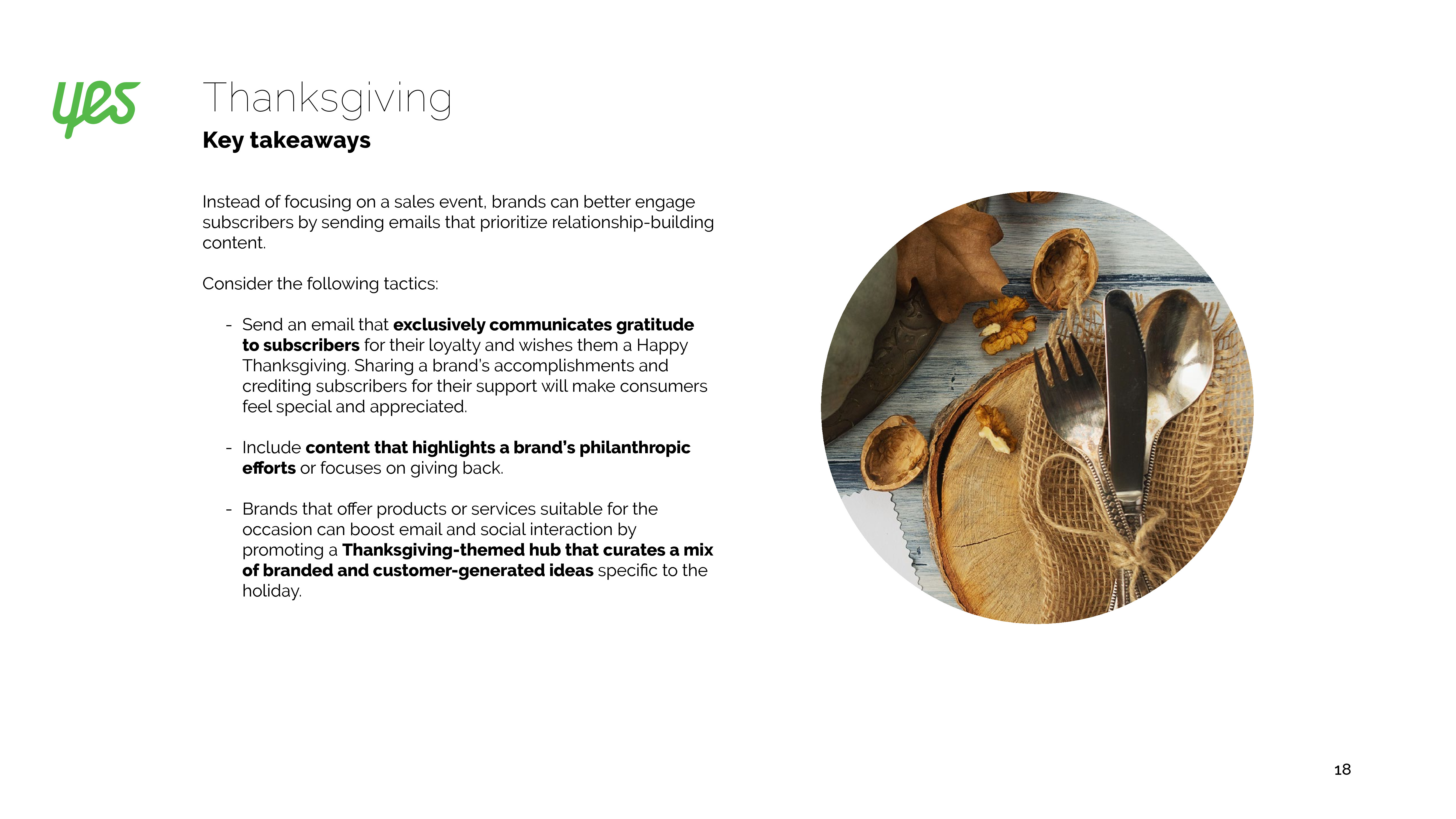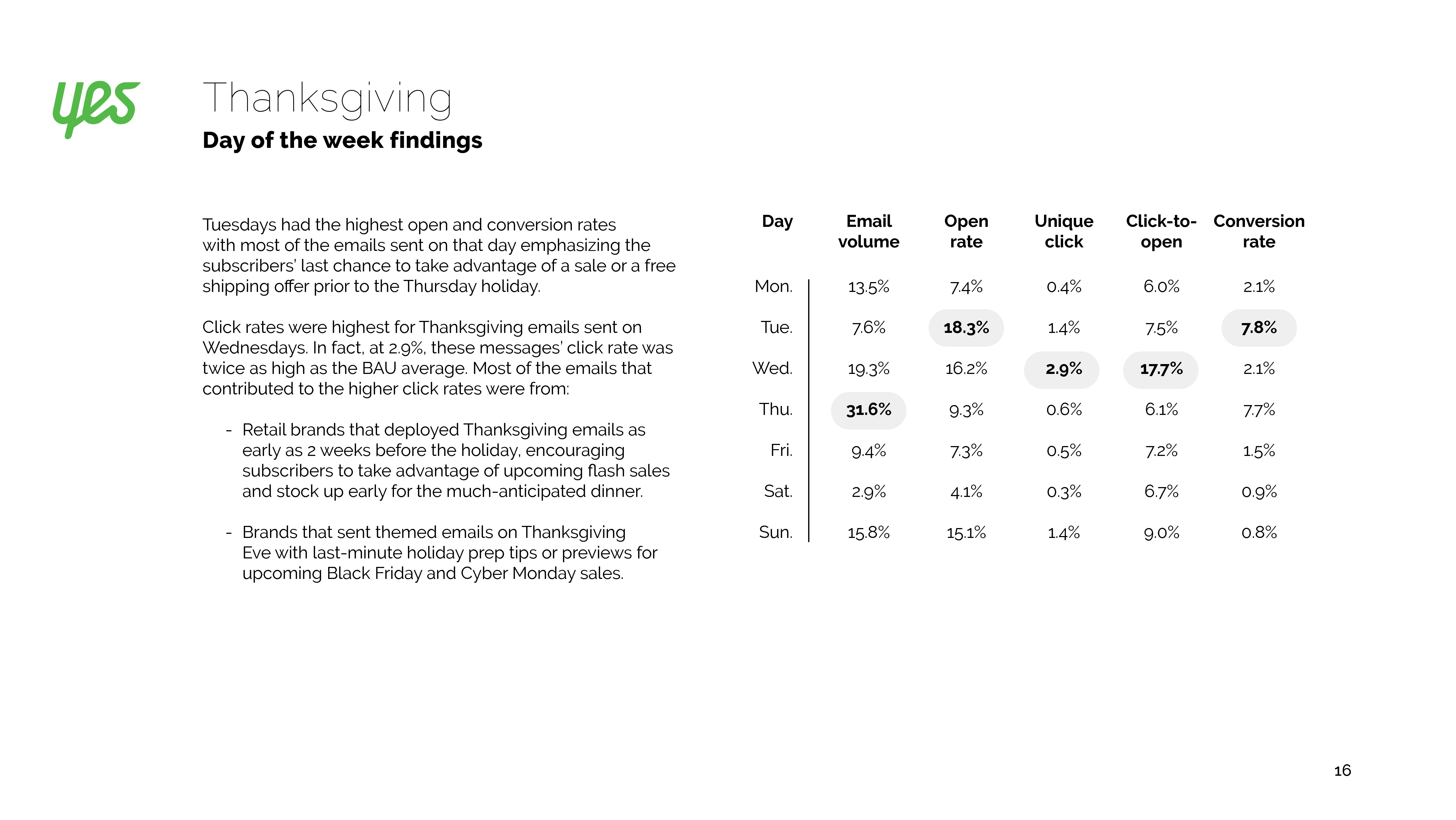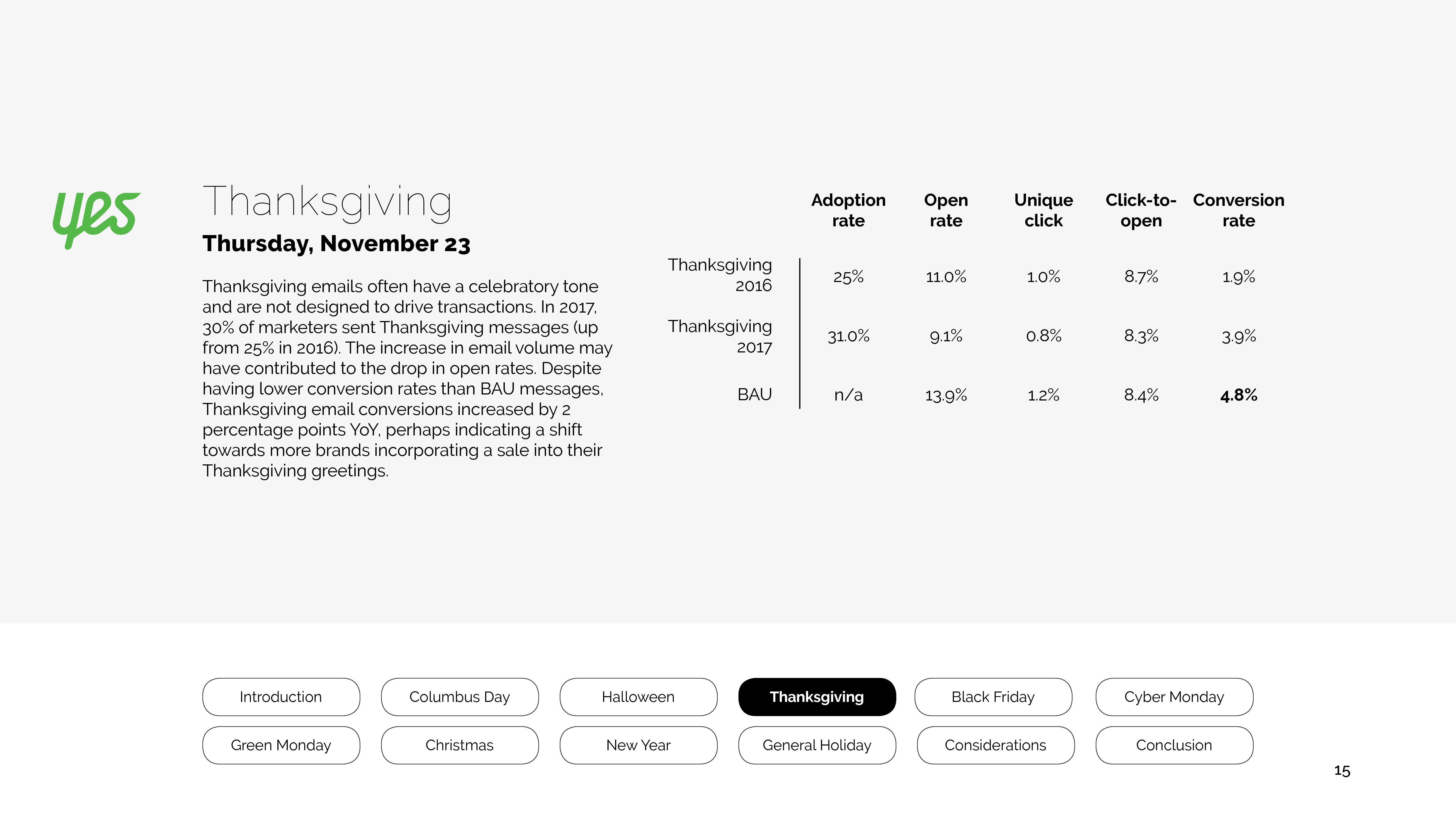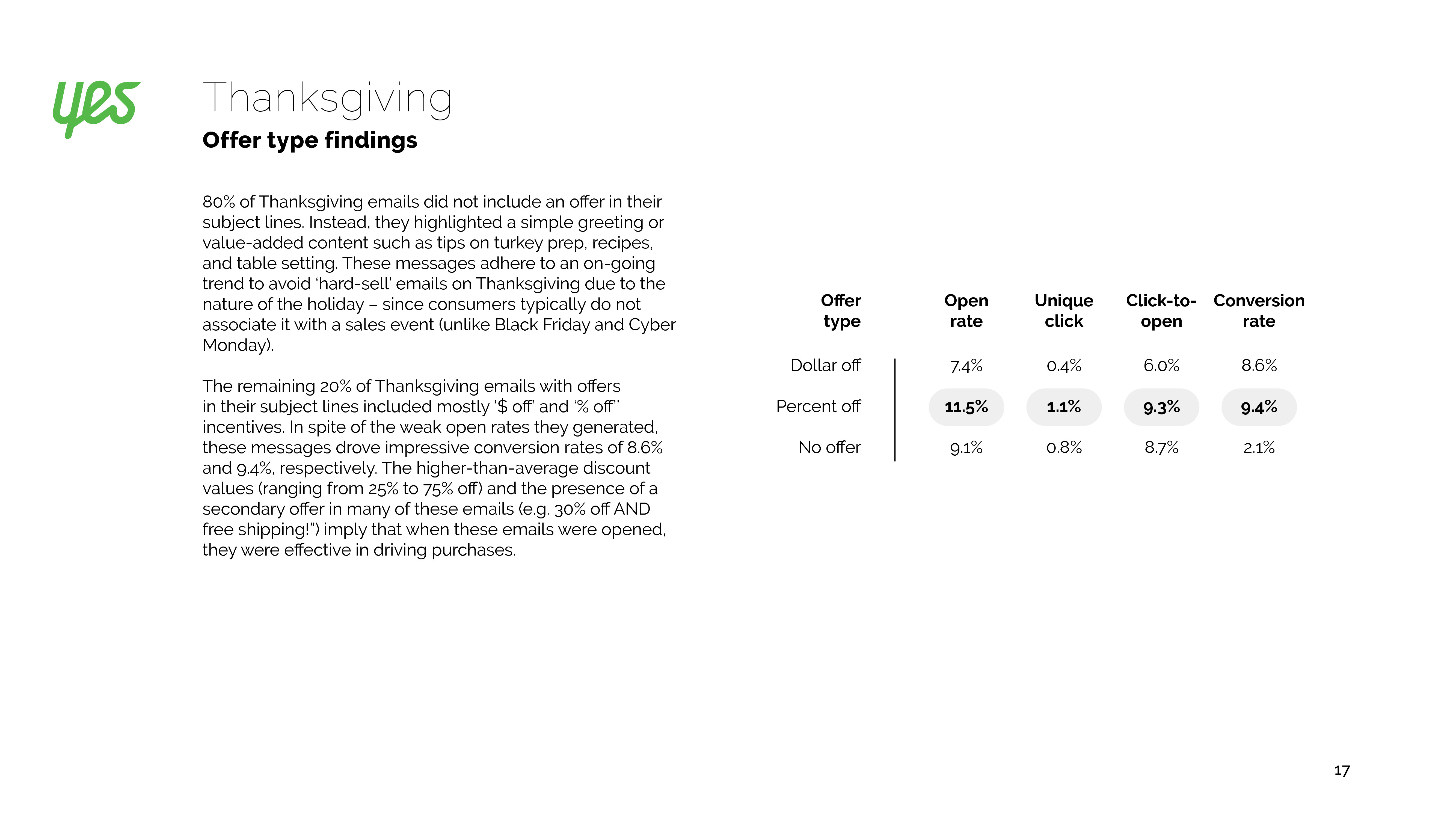 感恩节电子邮件通常是祝福,而不是为了提高交易量。2017年,30%的营销人员发送了感恩消息。数量庞大可能导致打开率下降。