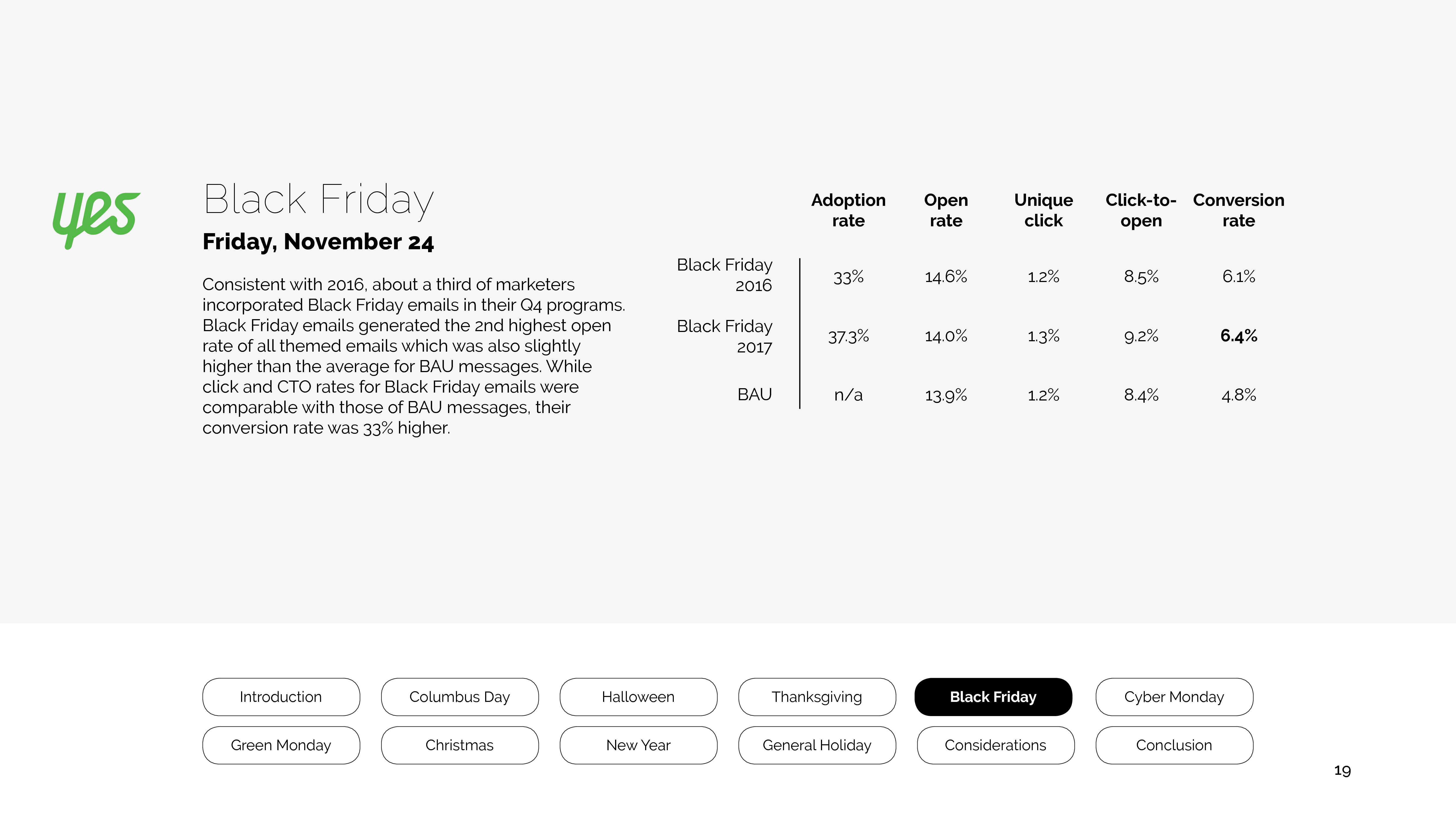 2017年,约1/3的营销人员将黑色星期五纳入第四季度营销计划。其主题邮件的打开率也是第二高的。