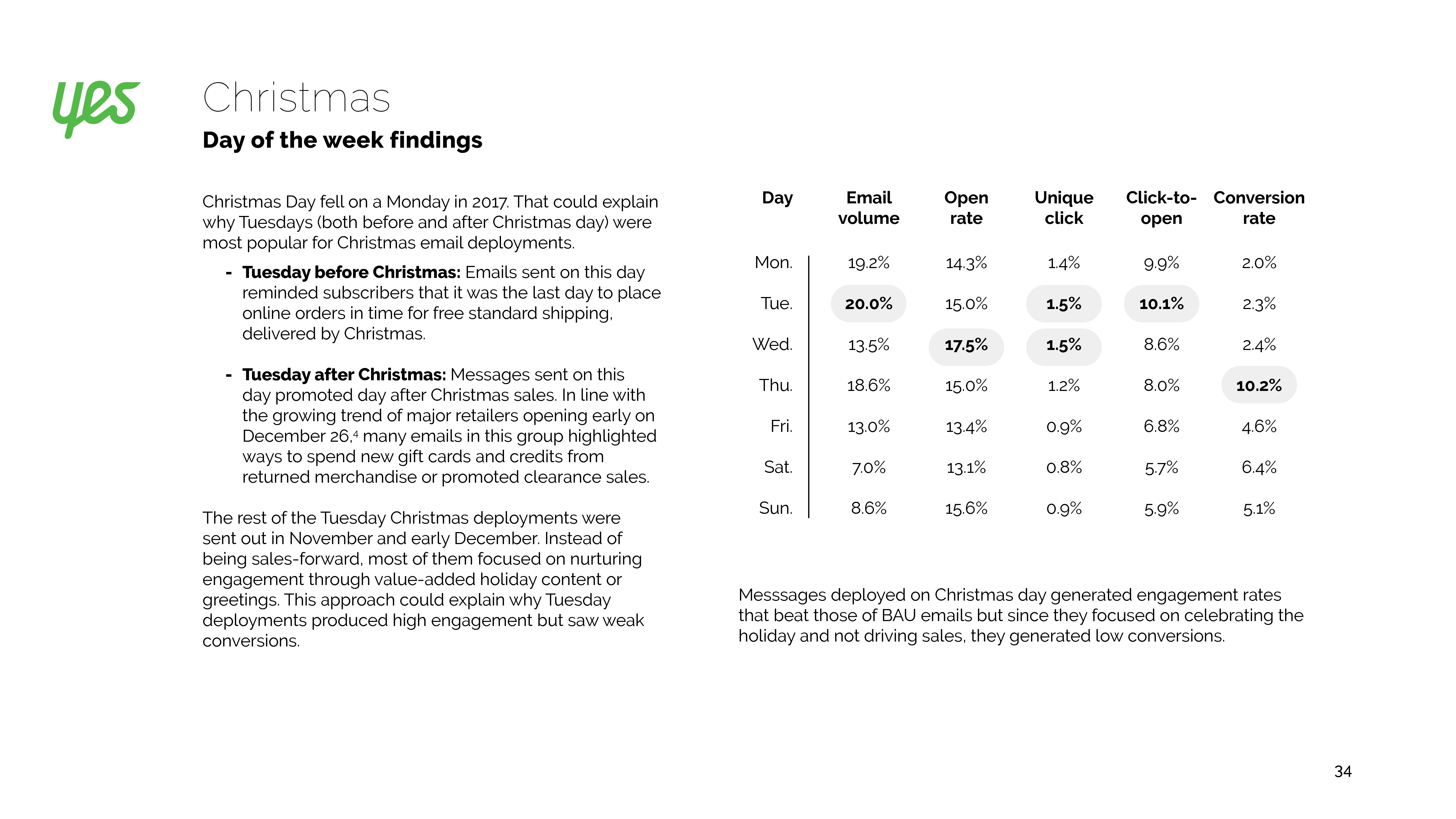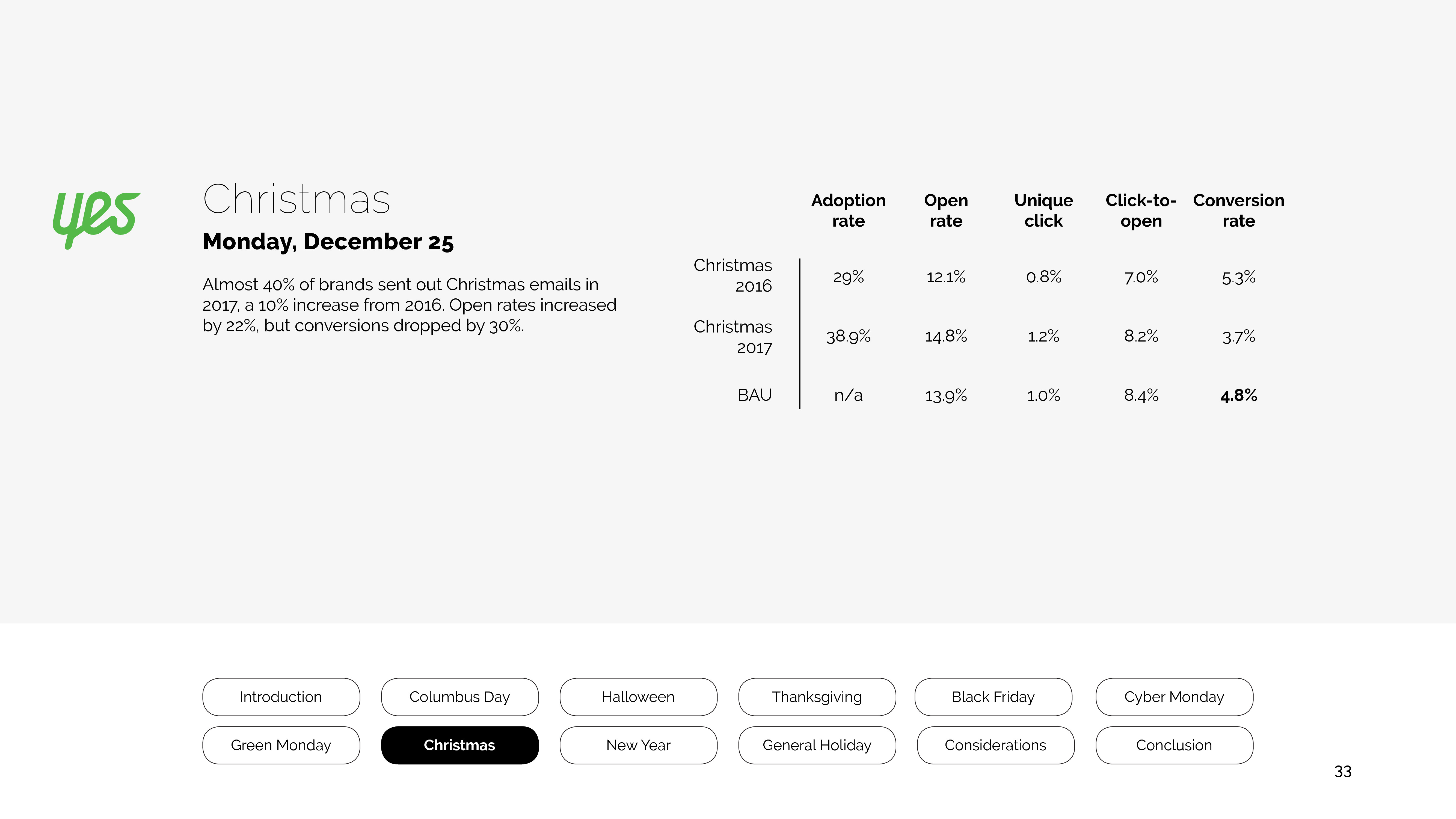40%的品牌在2017年圣诞节发送了电子邮件,和前一年比增长10%。打开率提高22%,转化率则下降30%。
