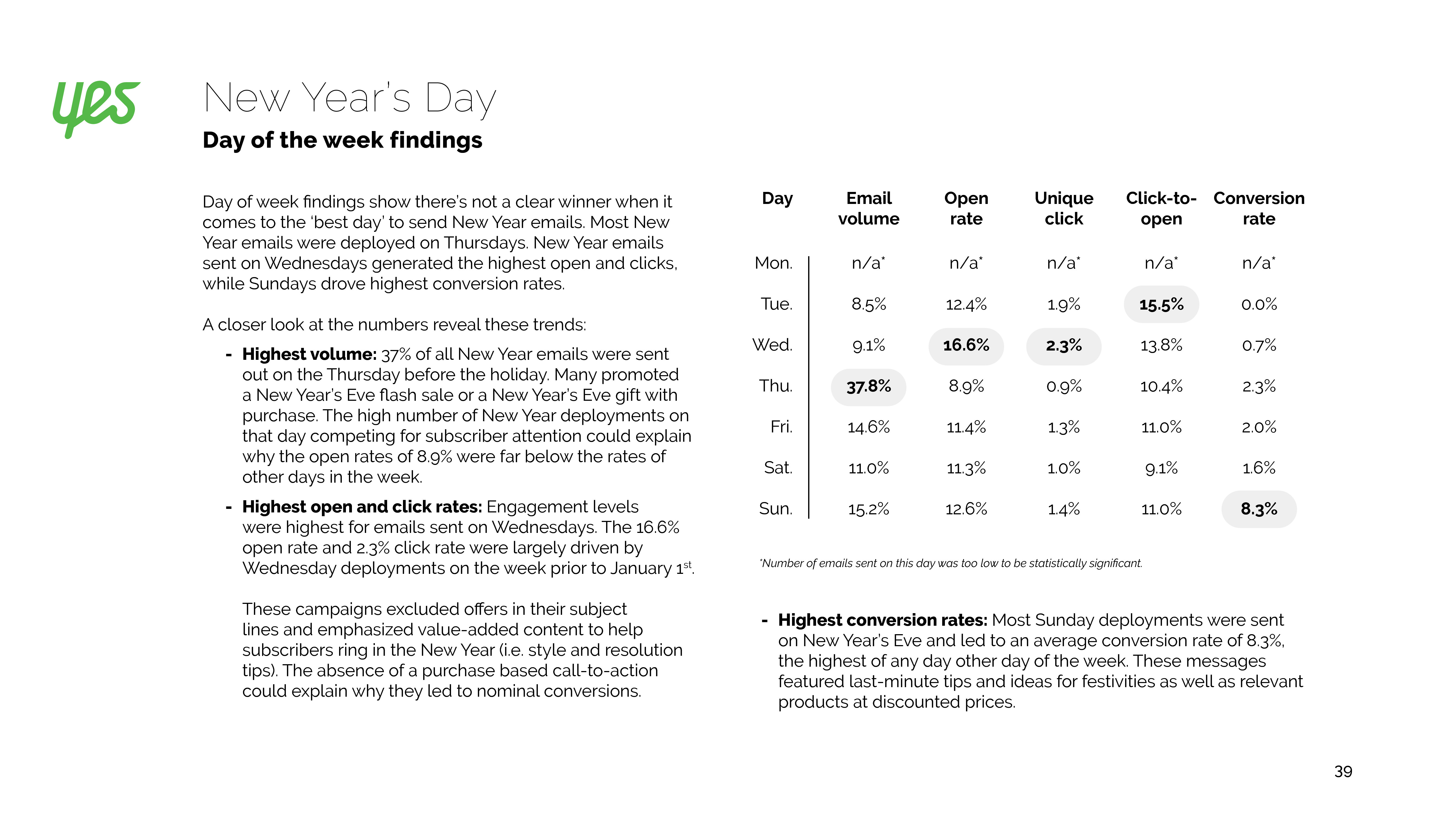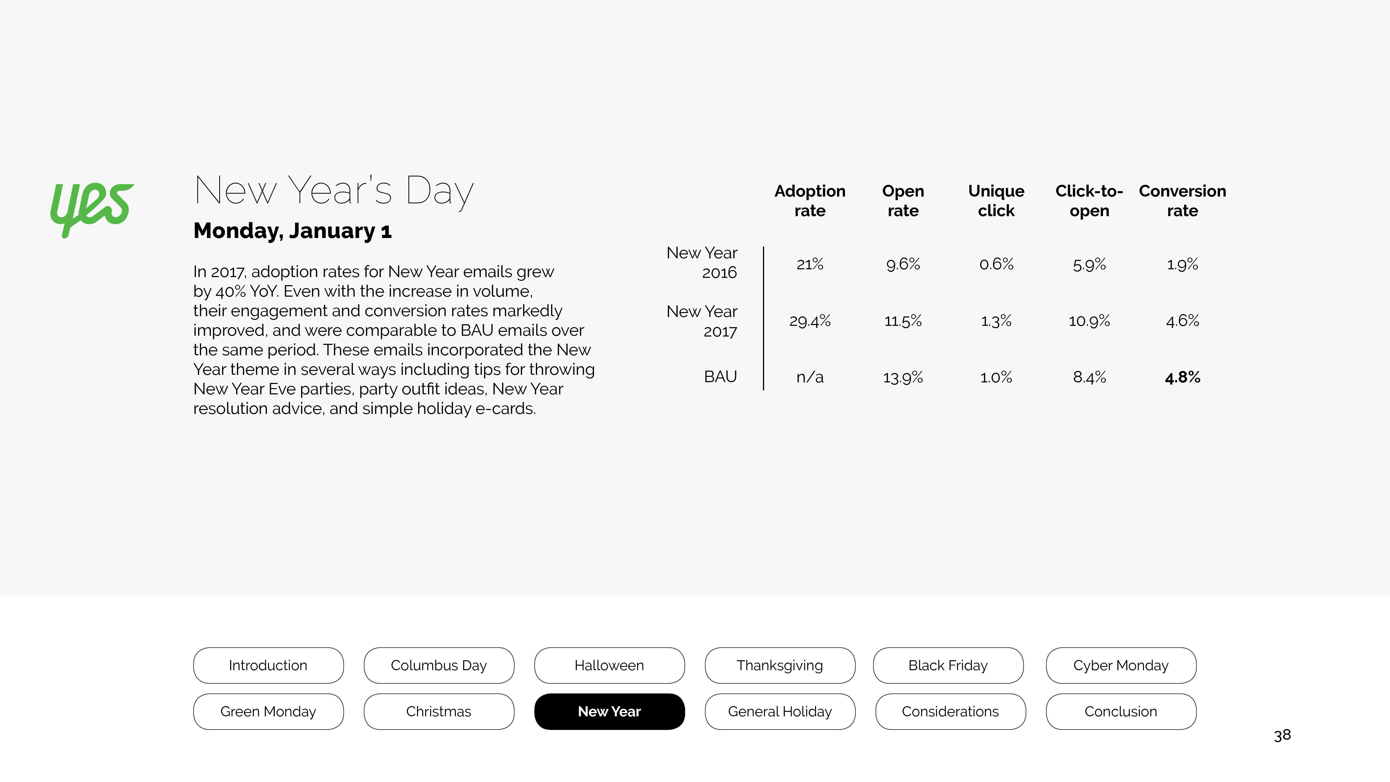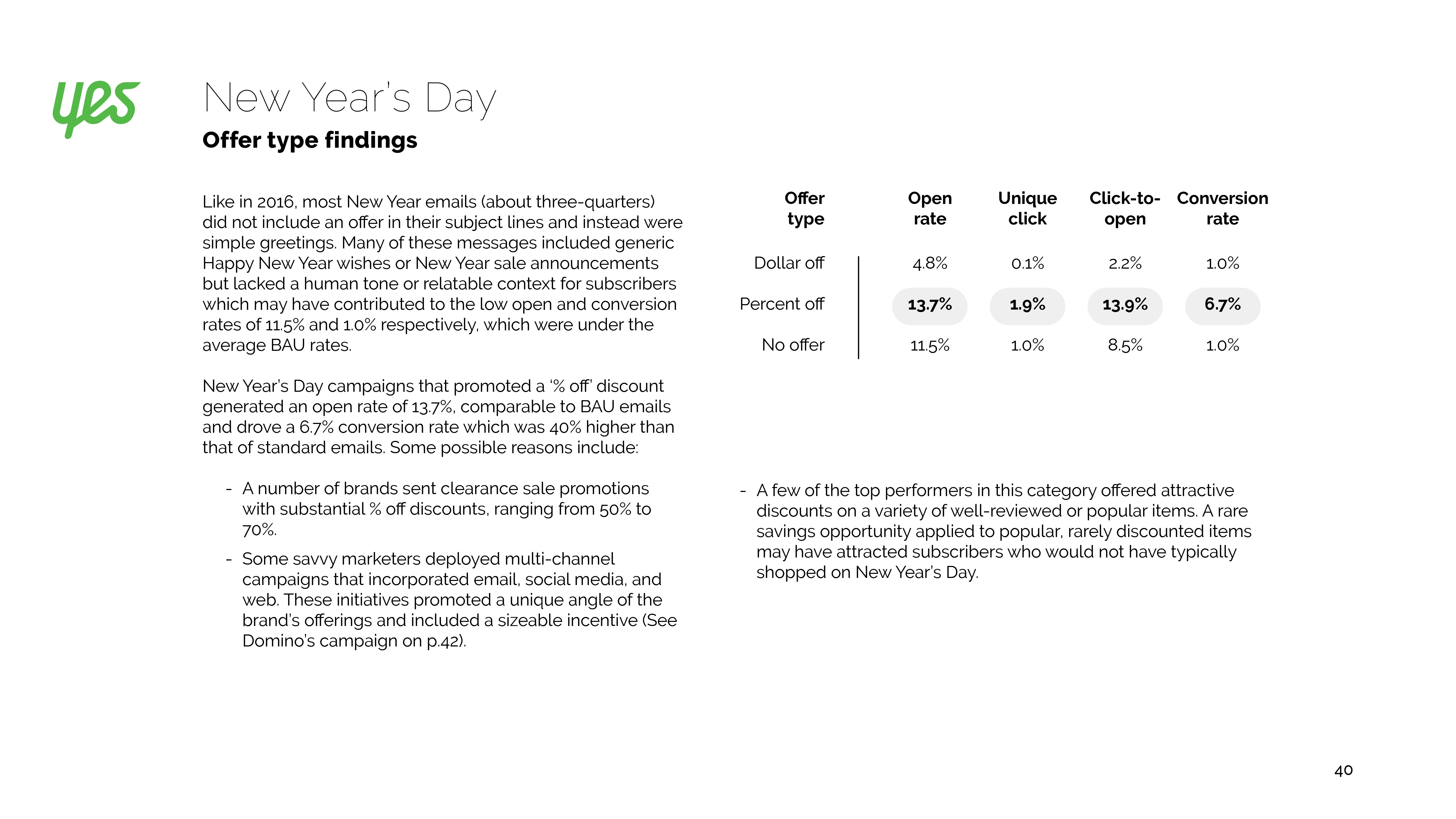 新年电子邮件发送增长40%,参与度和转换率也有所改善。