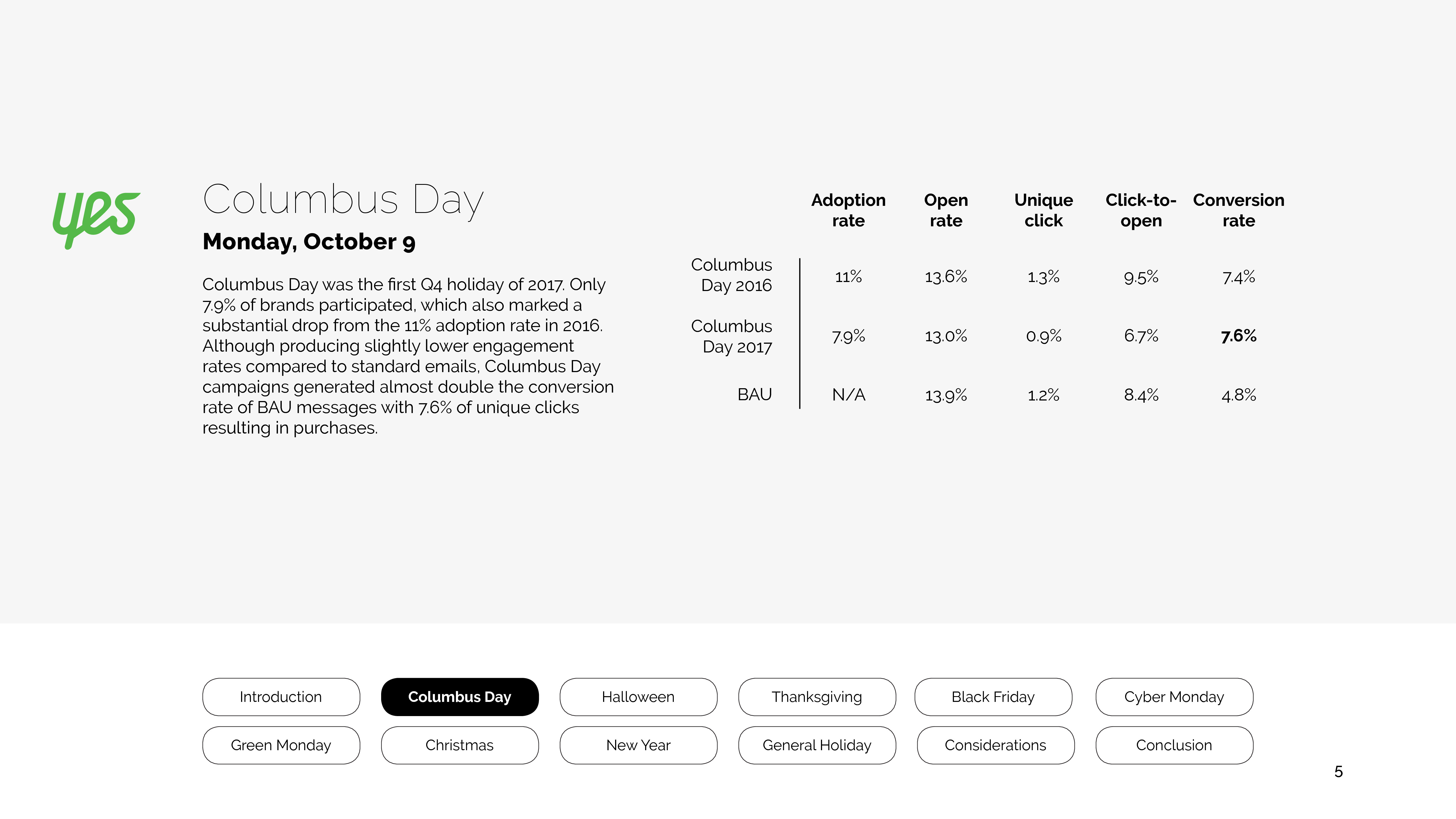 哥伦布日是第四季度的第一个大事件,只有7.9%的品牌参与,比2016年(11%)更低。
