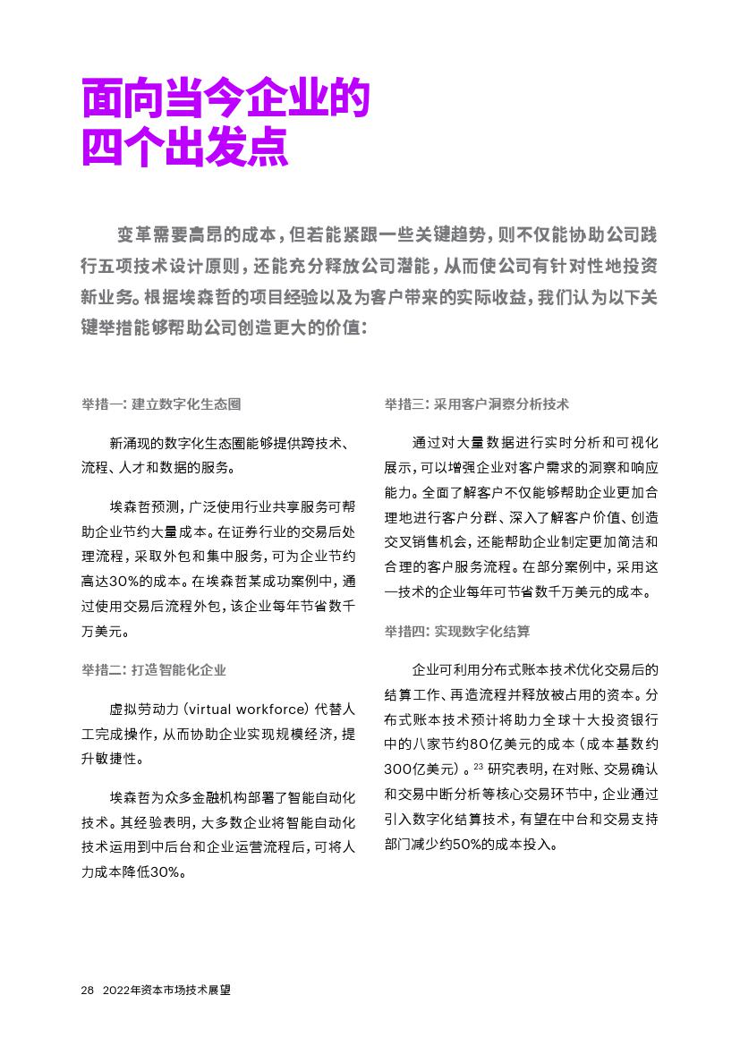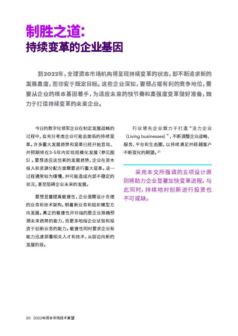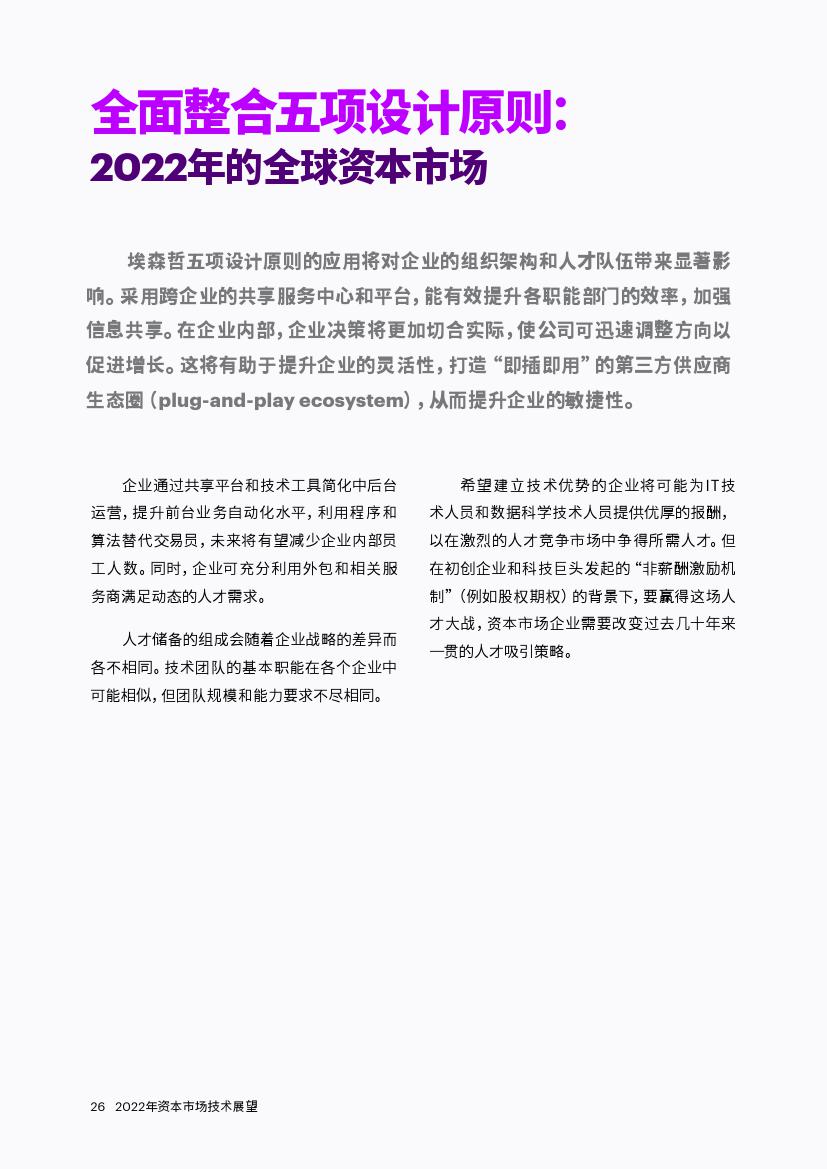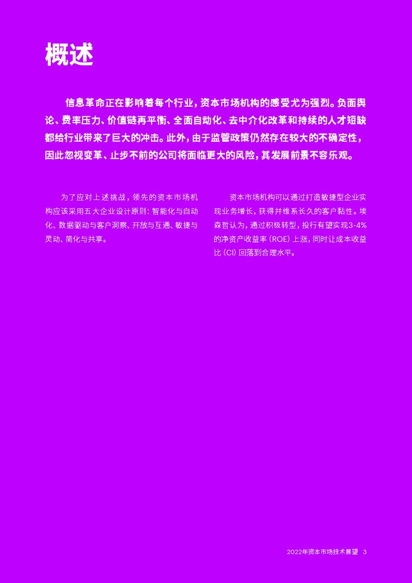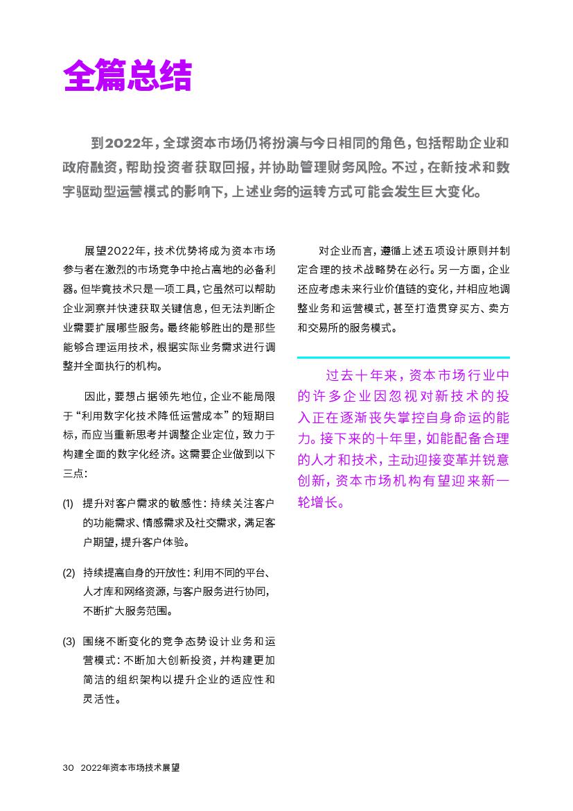 过去十年来,资本市场行业中的许多企业因忽视对新技术的投入正在逐渐丧失掌控自身命运的能力。当我们迈向2022年,如能配备合理的人才和技术,主动迎接变革并锐意创新,资本市场机构有望迎来新一轮增长。