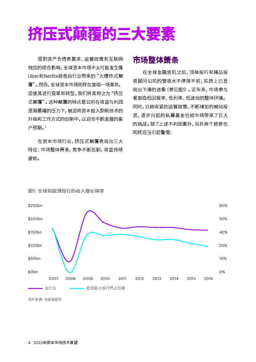 受到资产负债表要求、监管政策和互联网效应的综合影响,全球资本市场不太可能发生像Uber和Netflix给各自行业带来的“大爆炸式颠覆”。然而,全球资本市场同样在面临一场革命,迫使其进行变革和转型,我们将其称之为“挤压式颠覆”。这种颠覆的特点是公司在收益与利润逐渐萎缩的压力下,被迫将资本投入到新技术的升级和工作方式的创新中,以迎合不断发展的客户预期。 在资本市场行业,挤压式颠覆表现出三大特征: