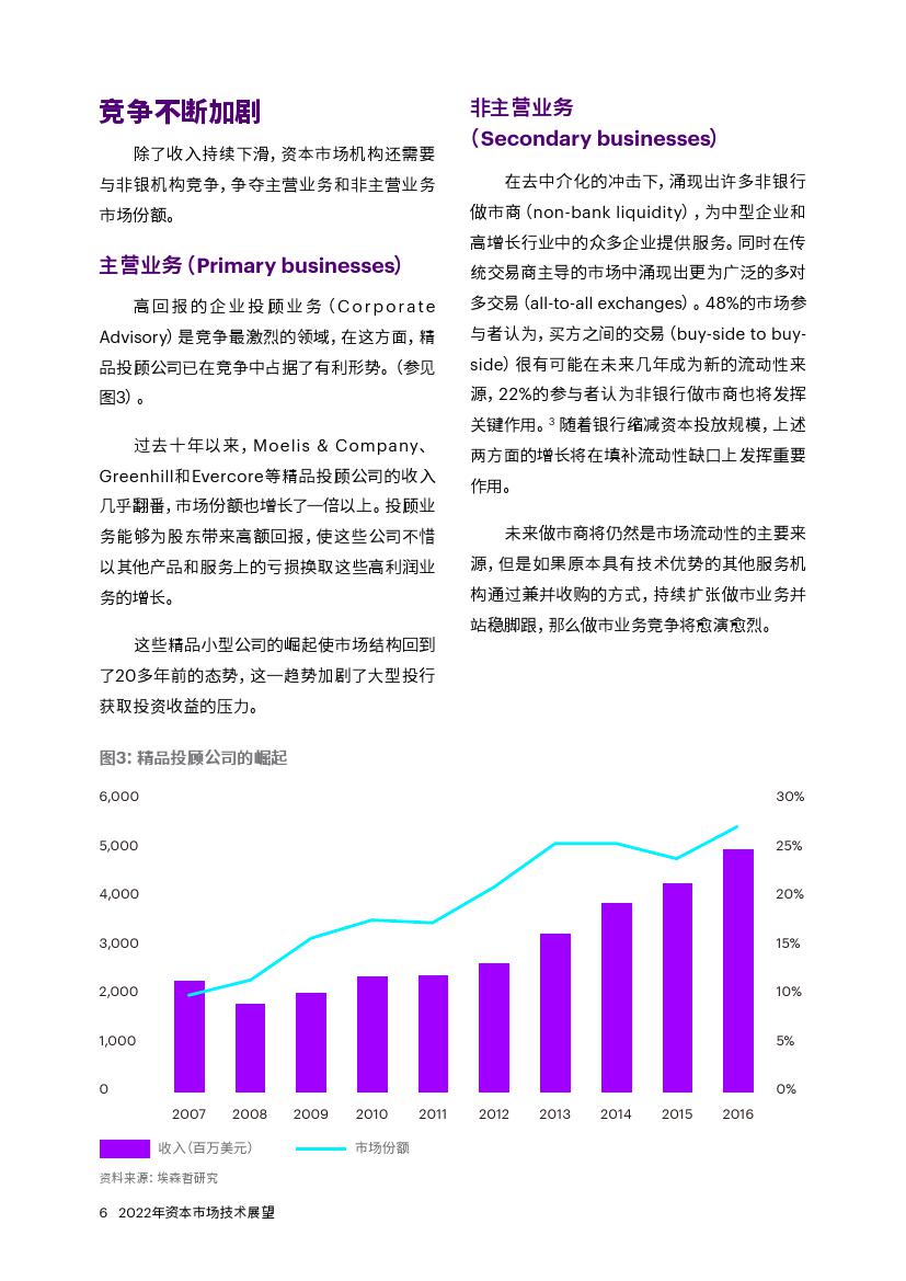 - 竞争不断加剧:除了收入持续下滑,资本市场机构还需要与非银机构竞争,争夺主营业务和非主营业务市场份额。