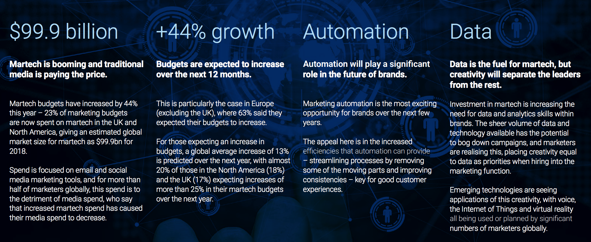 调查显示,英国和北美的品牌去年在“营销科技”上的投入较2016年增长23%,美国公司的技术预算中有63%是在内部使用的,而2016年是44%。