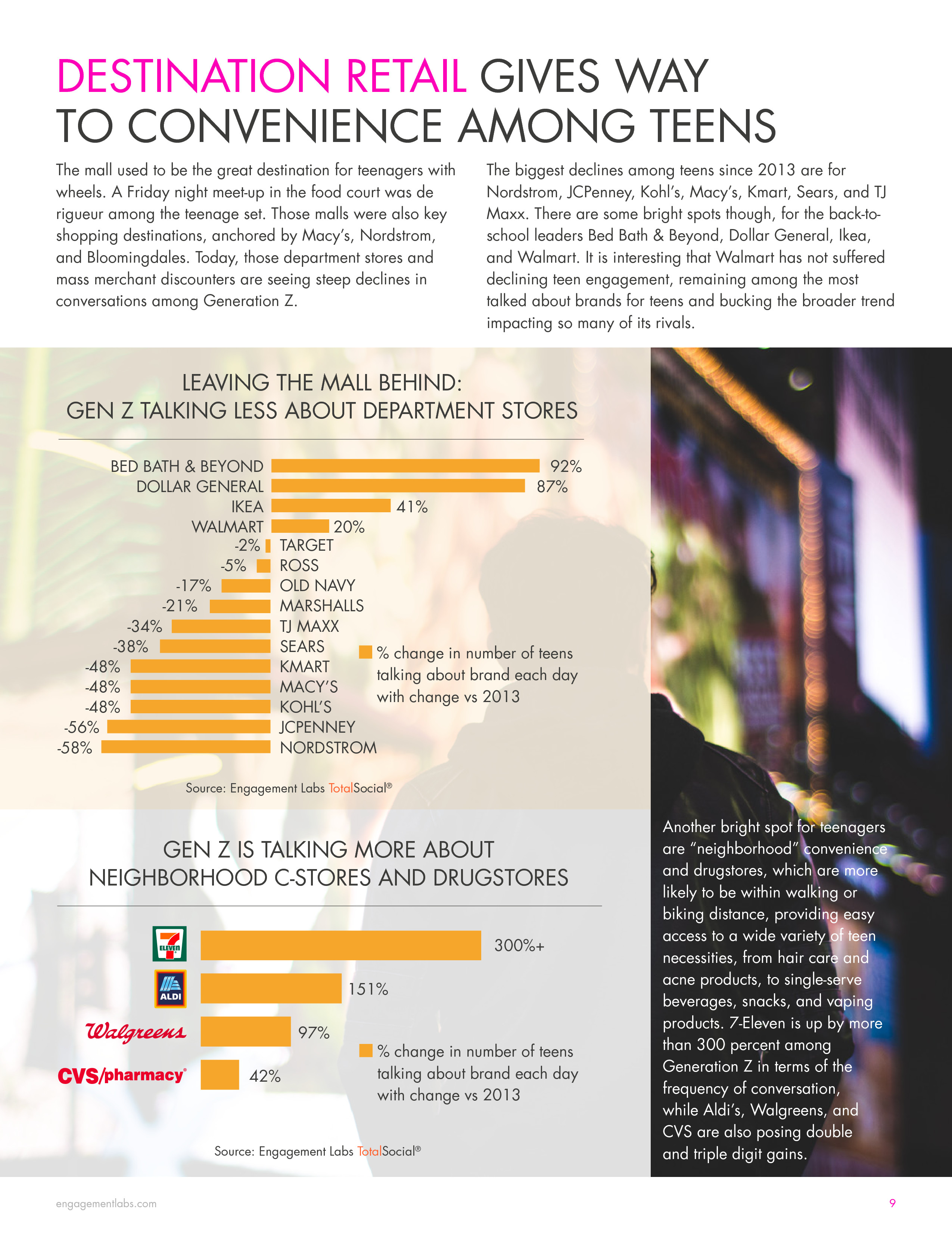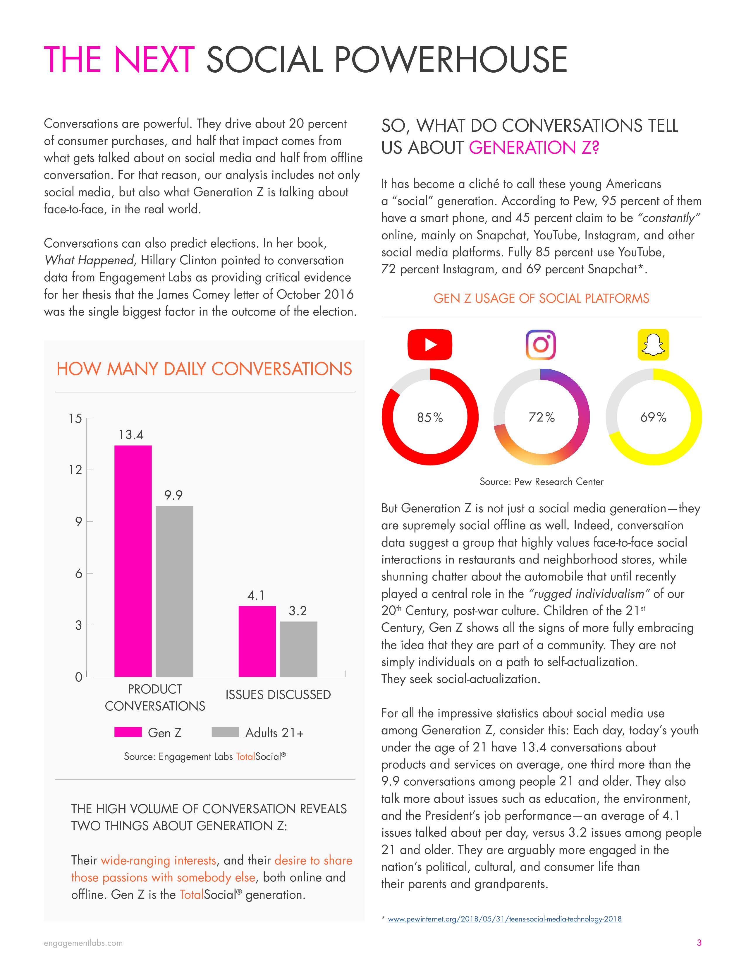 Z世代(13-20岁)为美国零售销售额贡献1/5(包括线上和线下),因此营销人员也开始关注这部分人群。Engagement Labs的最新调查发现,Z世代日常关于产品的对话比成年人多35%,分别是13.4%和9.9%。