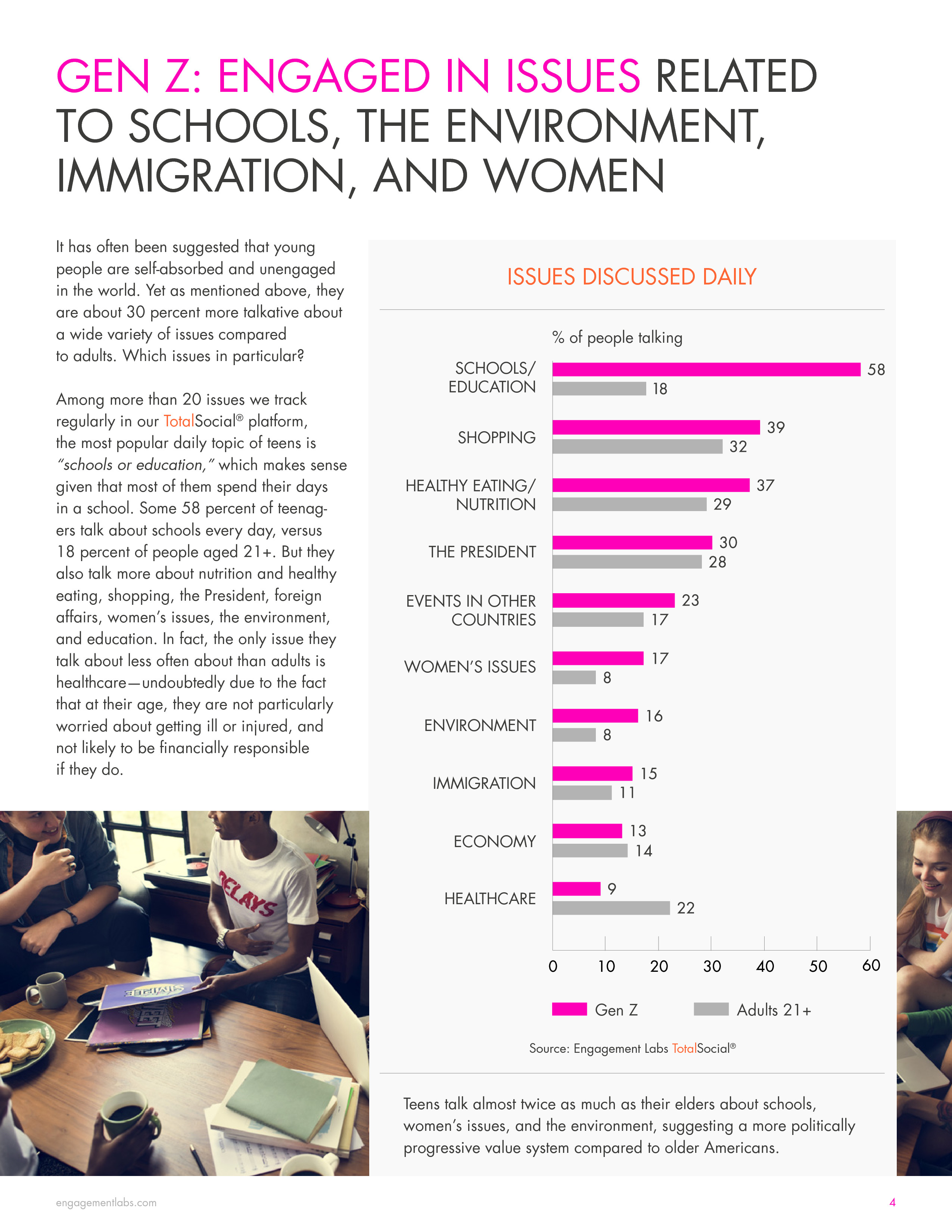 目前,青少年谈论最多的话题是学校和教育。58%的Z世代每天谈论学校,21岁及以上的成年人中只有18%的人在谈论这个话题。