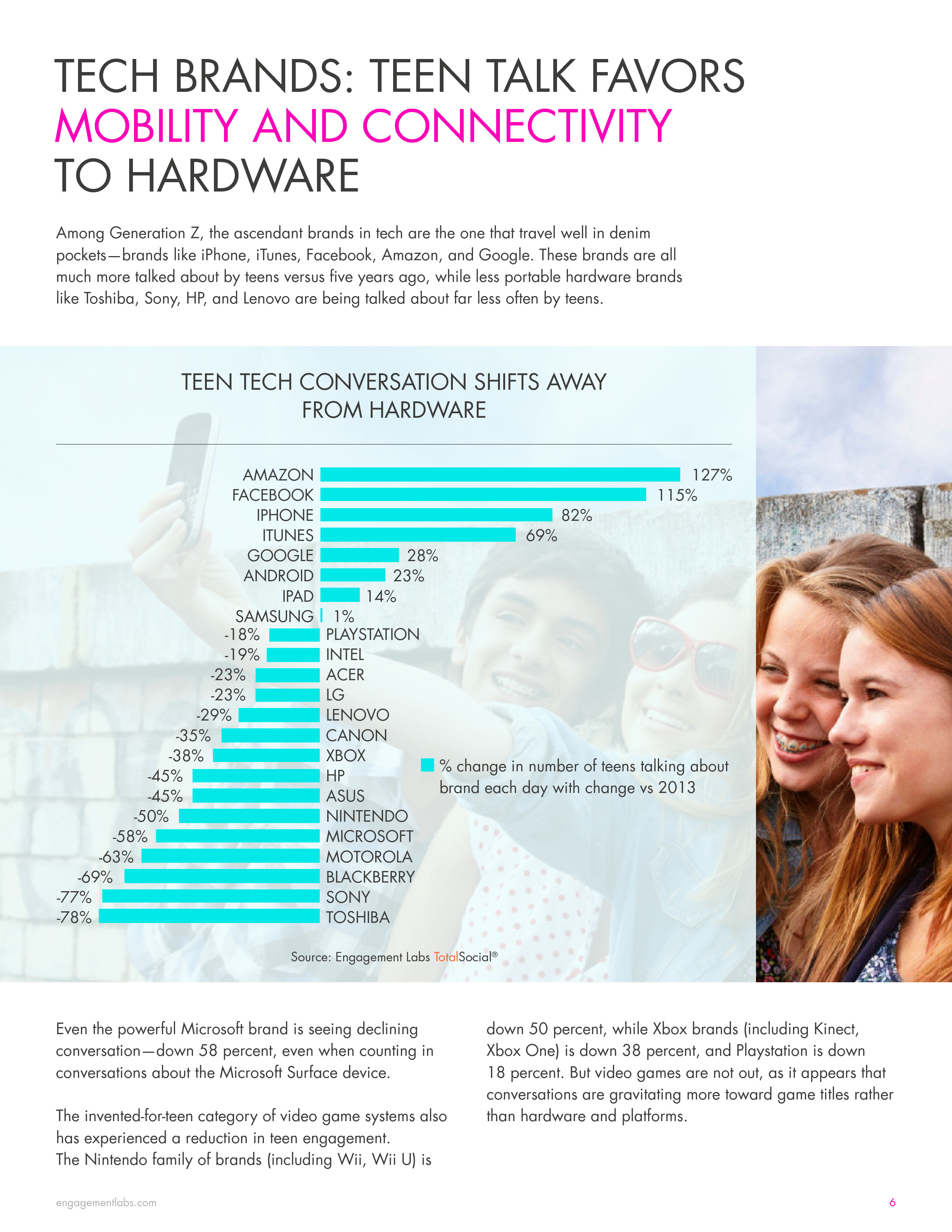 和2013年相比,更少有青少年谈论东芝、微软和华硕等品牌。尽管游戏作为一个流行话题在青少年中十分受欢迎,但是他们对任天堂、Xbox和PlayStations的关注度较低,这反映了移动游戏平台的重要性。虽然关于Facebook的讨论不都是积极的,但是和五年前相比,谈论亚马逊(+127%)和Facebook(+115%)的青少年人数增长两倍多。