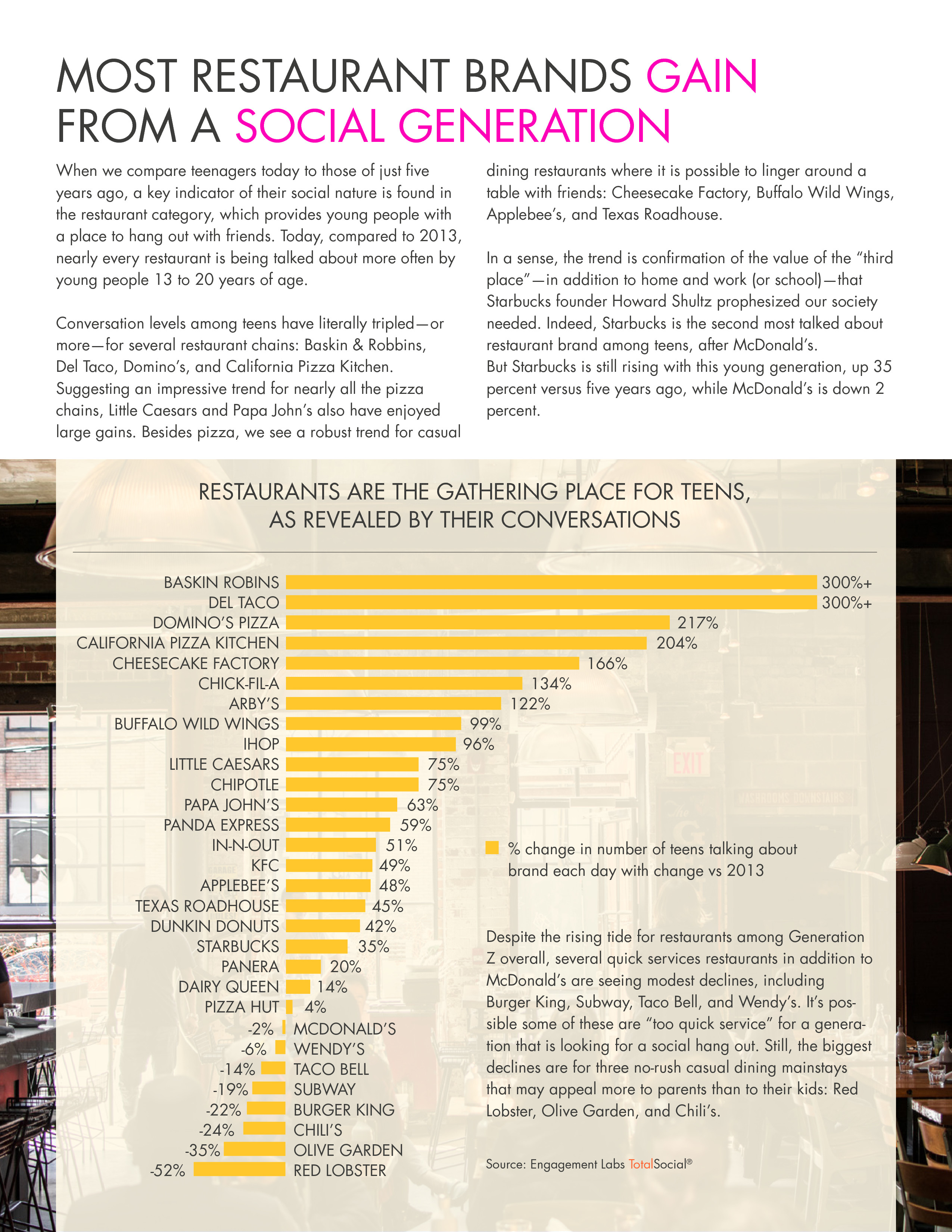 青少年关于餐馆话题比五年前更多了,Baskin & Robbins和Del Taco的话题增长两倍,Domino’s Pizza和California Pizza Chicken增长一倍。