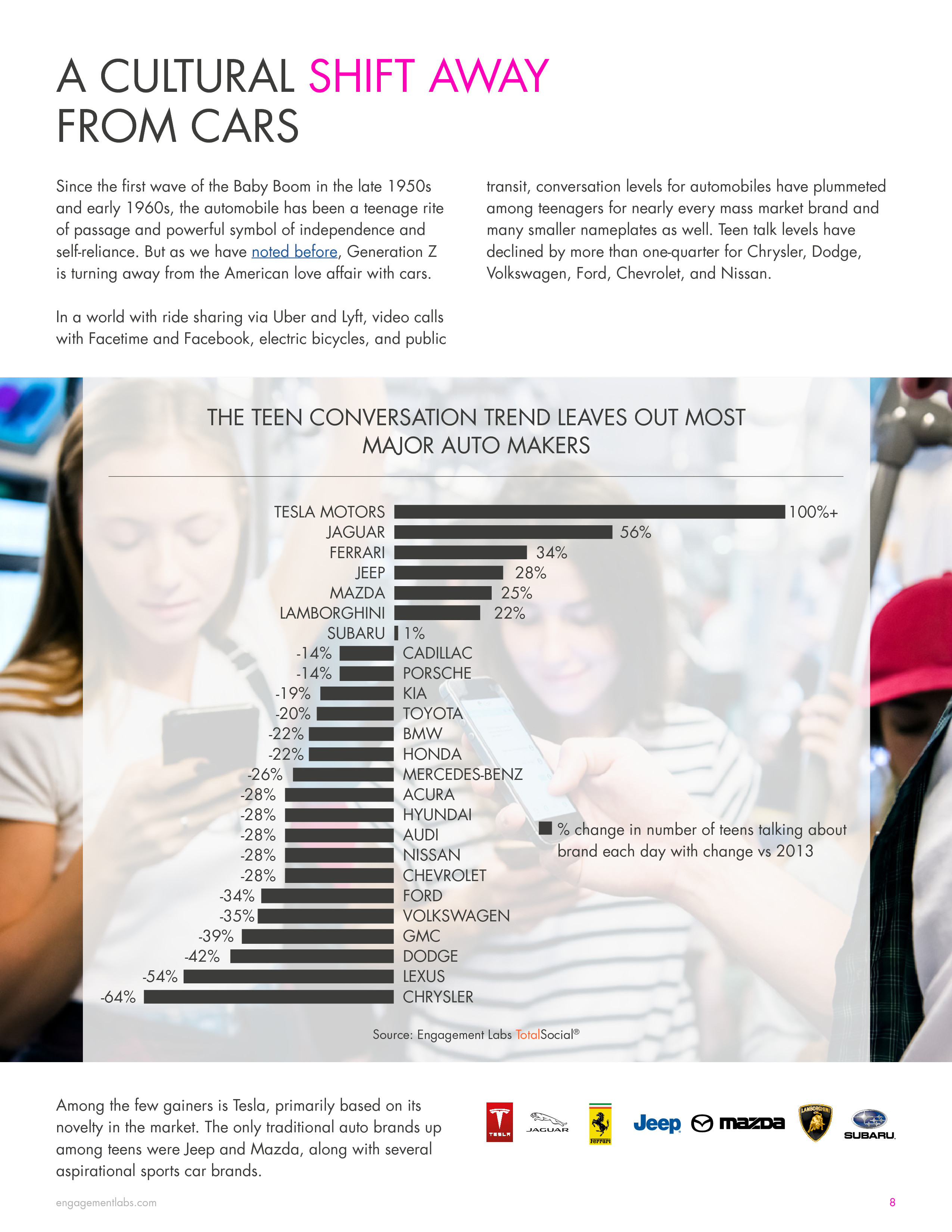 与餐馆不同,青少年关于汽车的谈话减少了。兰博基尼、吉普、法拉利和Jaguary有些优势,但是特斯拉是唯一一个谈话加倍的汽车品牌。