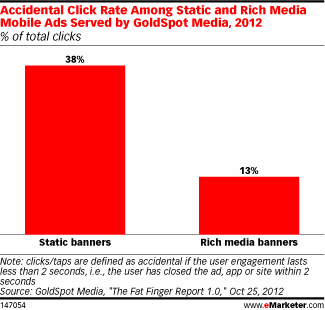而最近来自GoldSpot Media的研究分析了这个问题,2012年10月,它们所投放的静态广告的点击中有38%属于意外,富媒体广告中则有13%属于意外点击