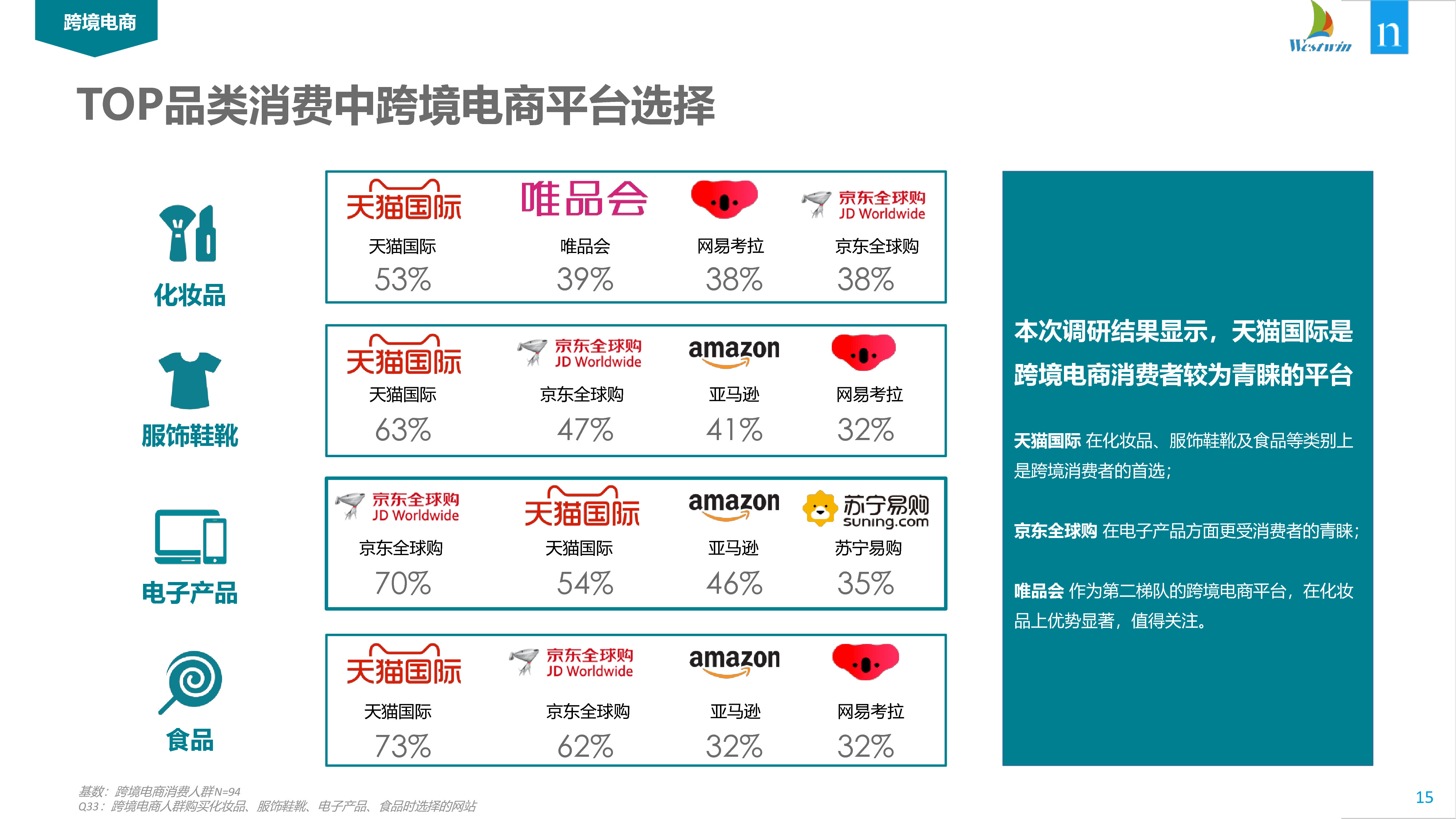 从最受欢迎的产品类别来看,天猫环球是中国消费者购买化妆品(53%)、服装、鞋类和食品的主要网站。然而,JD 全球被认为是购买电子设备最受欢迎的地方。因此,通过匹配产品和平台,品牌才能明智地考虑他们在中国的销售合作伙伴。