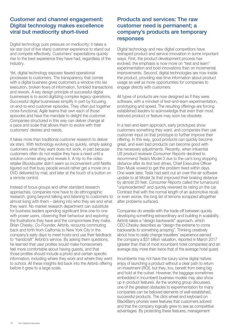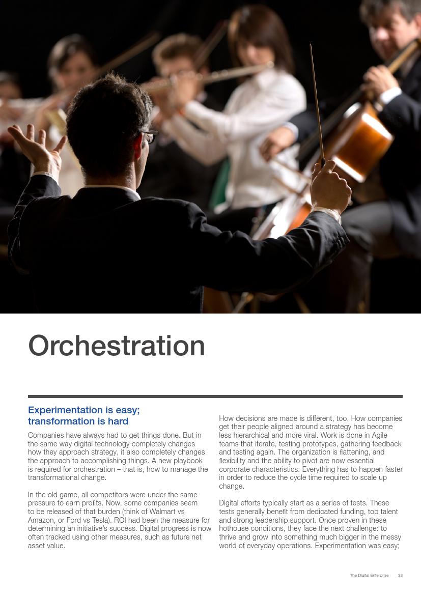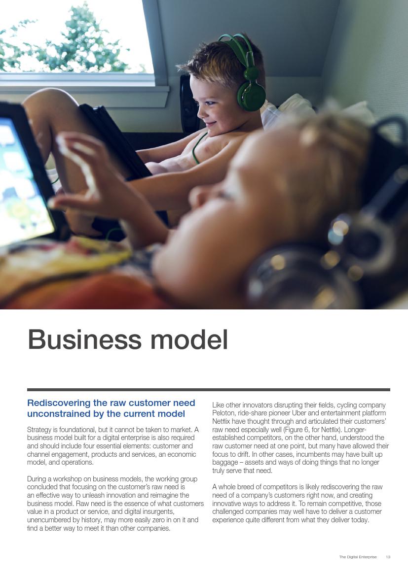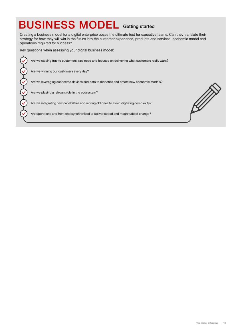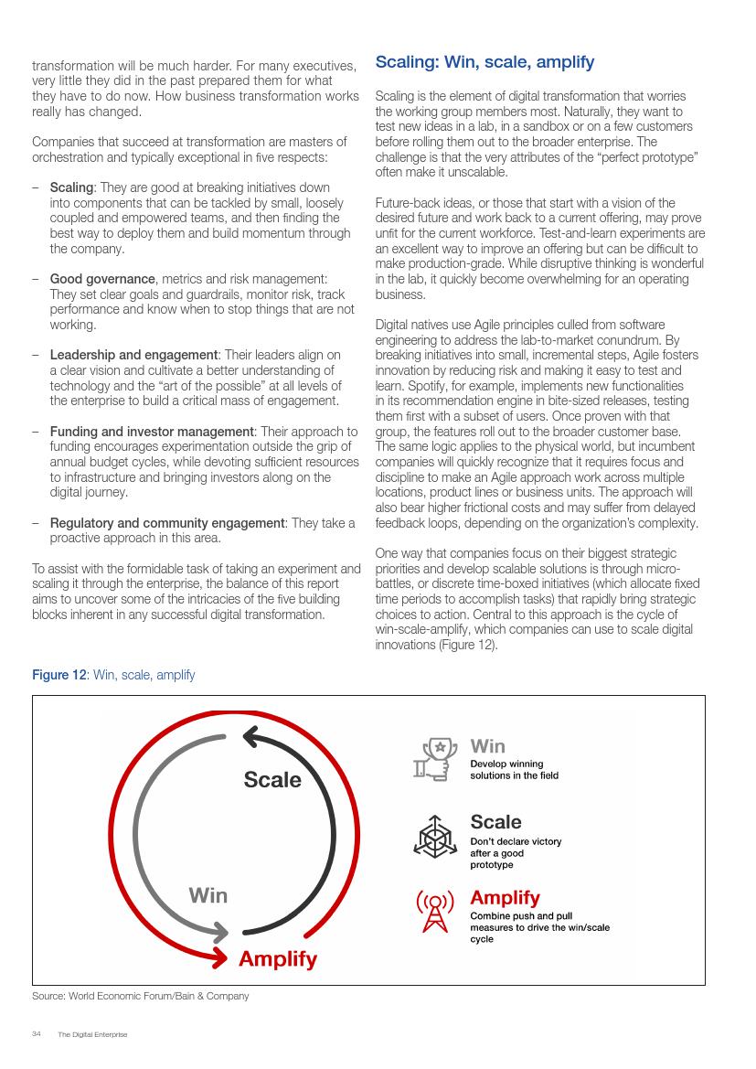 成功的企业了解并接受在不确定环境中能够发挥作用的数字化战略,通过“测试和学习”的思维模式取得成功。相对于卖产品而言,成功的企业更关注客户需求,通过匹配需求与迭代,不断更新产品或服务,来更好地满足客户需求。与此同时,这些企业不断地投资、开发能够帮助他们实现数字化目标的系统、技术和人才。他们也高度关注实施过程,以确保成功的试验结果能够规模化。