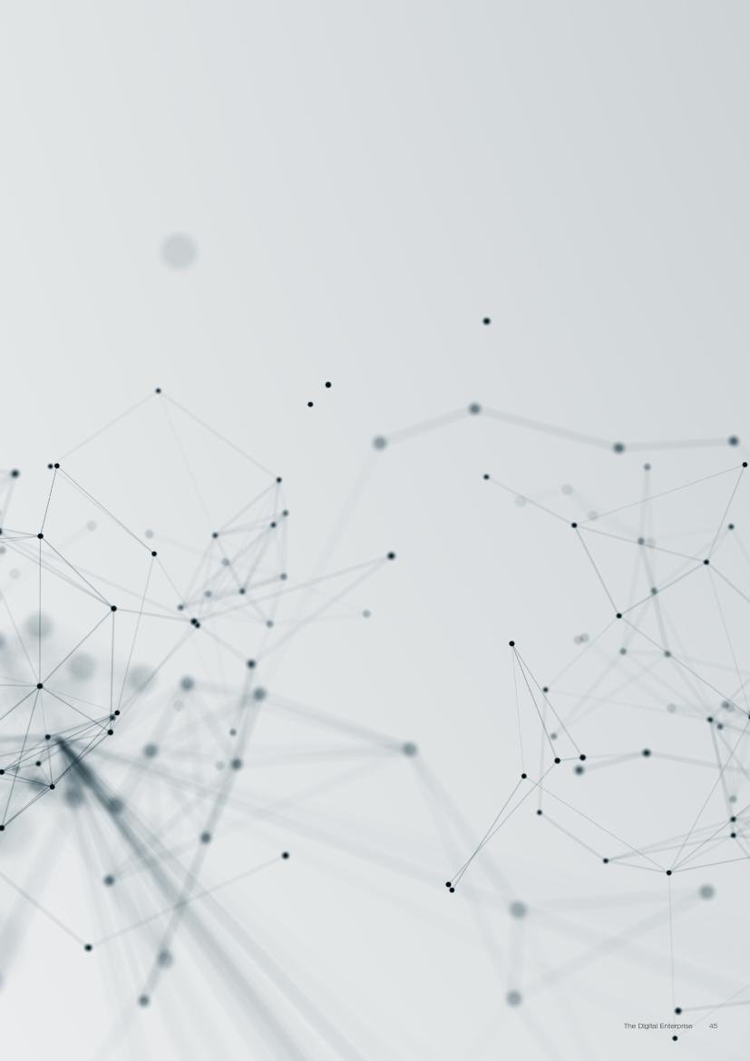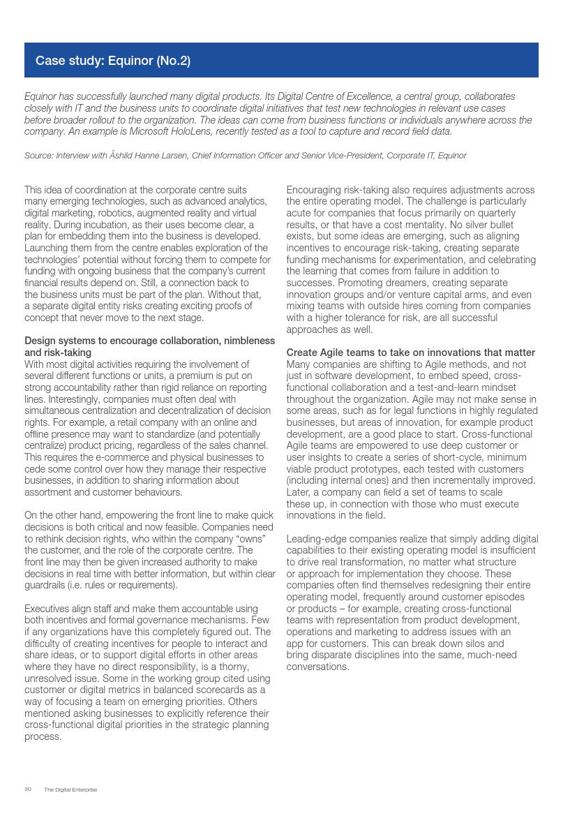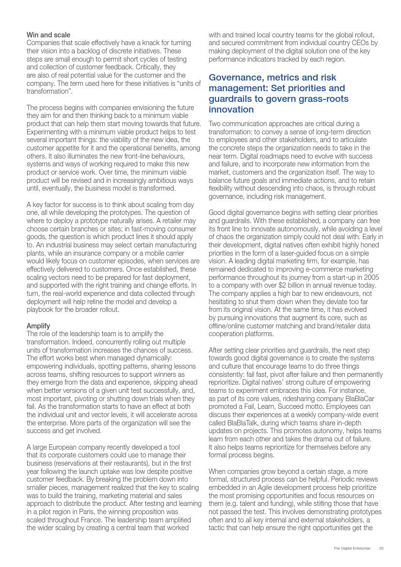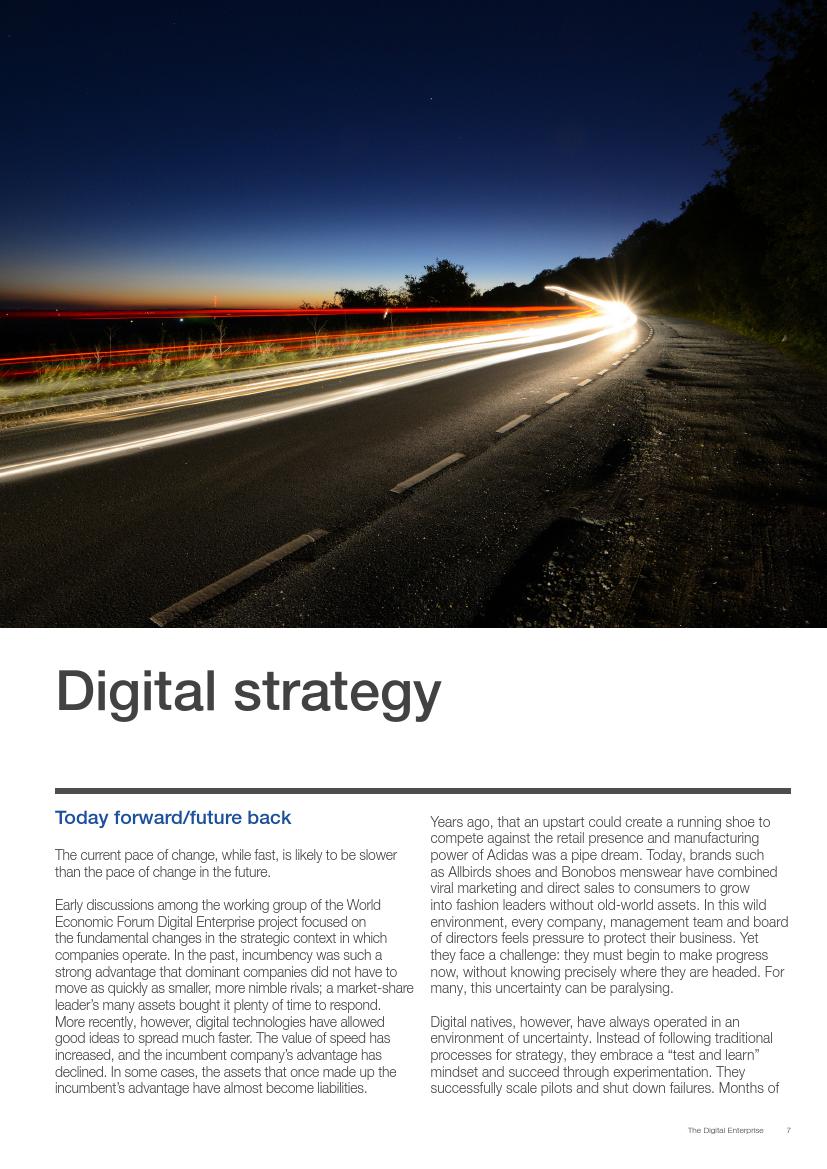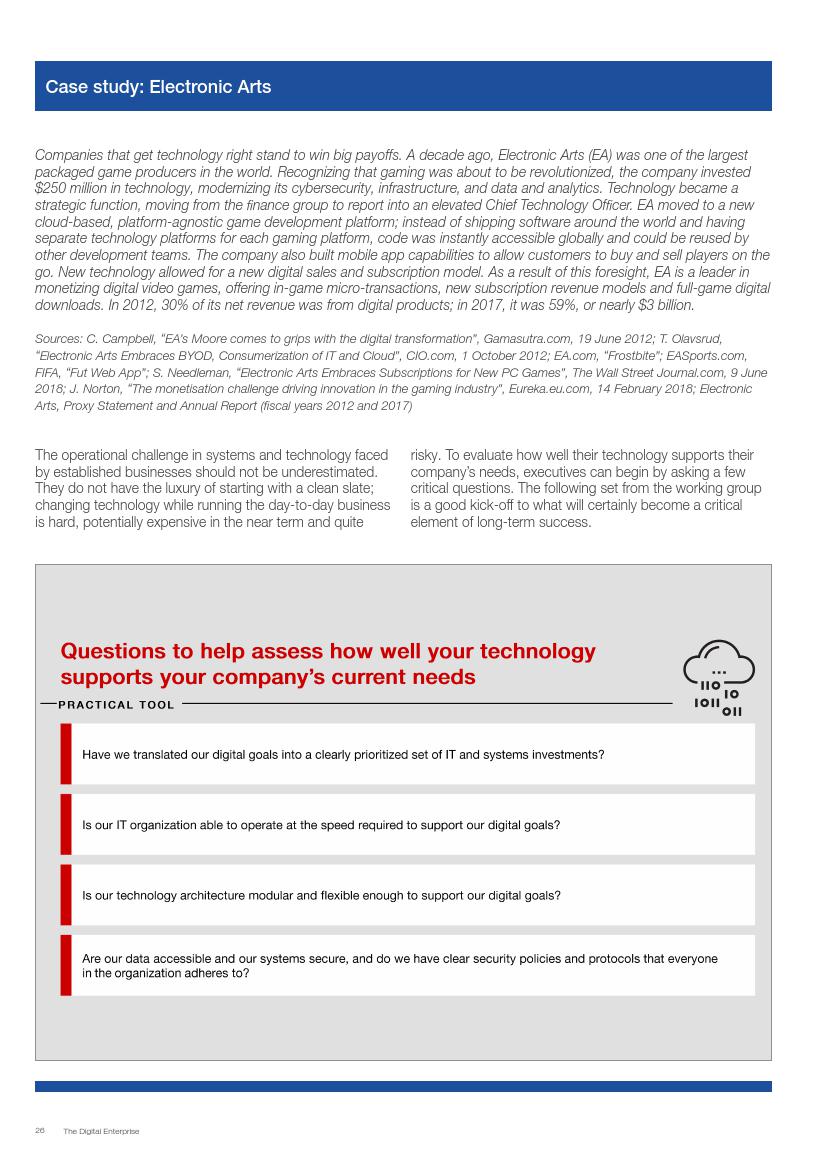 成功的企业了解并接受在不确定环境中能够发挥作用的数字化战略,通过“测试和学习”的思维模式取得成功。相对于卖产品而言,成功的企业更关注客户需求,通过匹配需求与迭代,不断更新产品或服务,来更好地满足客户需求。与此同时,这些企业不断地投资、开发能够帮助他们实现数字化目标的系统、技术和人才。他们也高度关注实施过程,以确保成功的试验结果能够规模化。