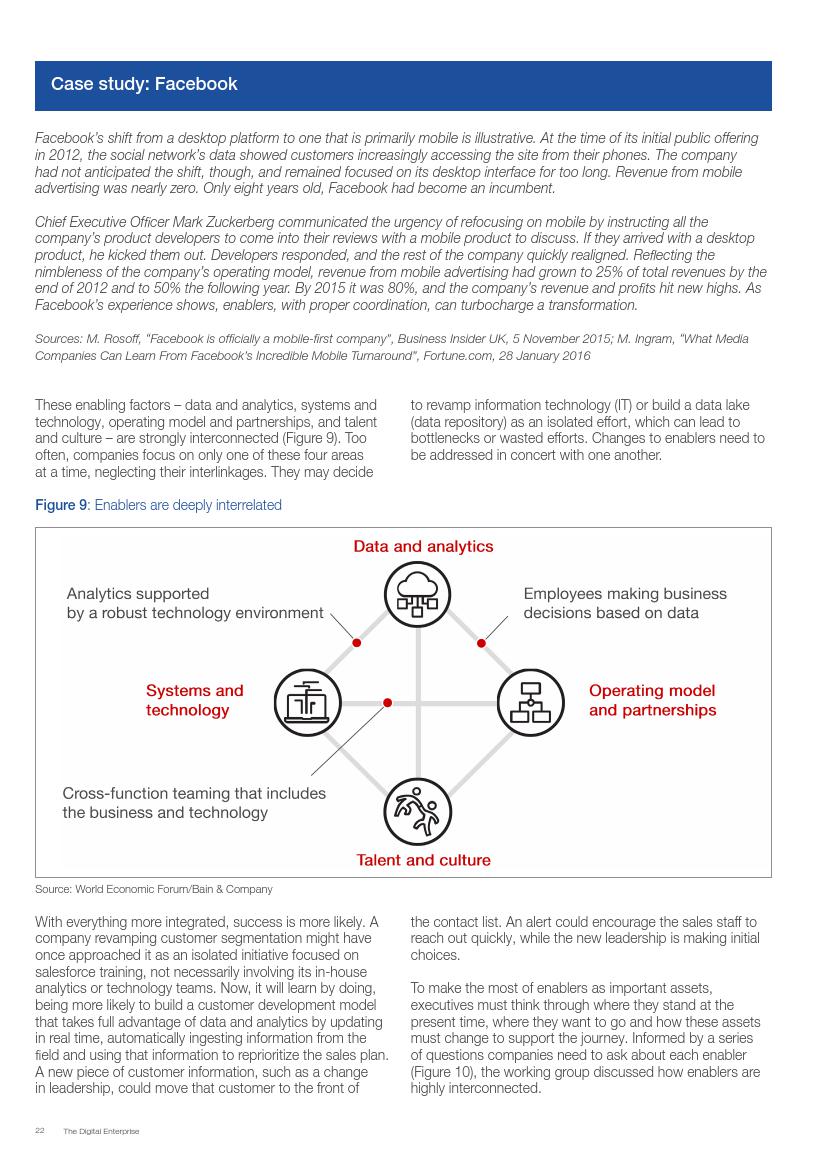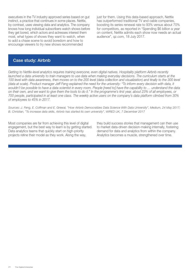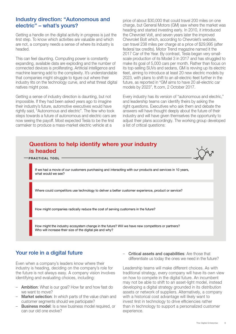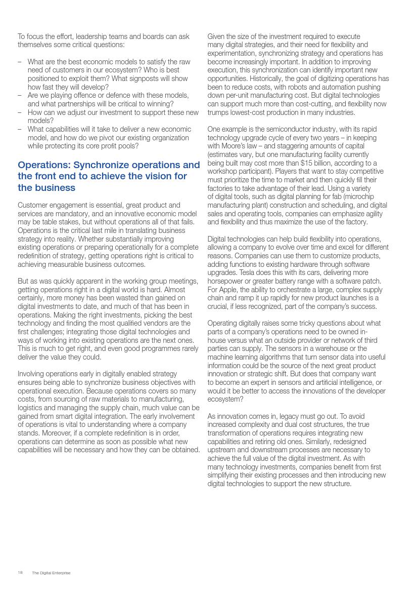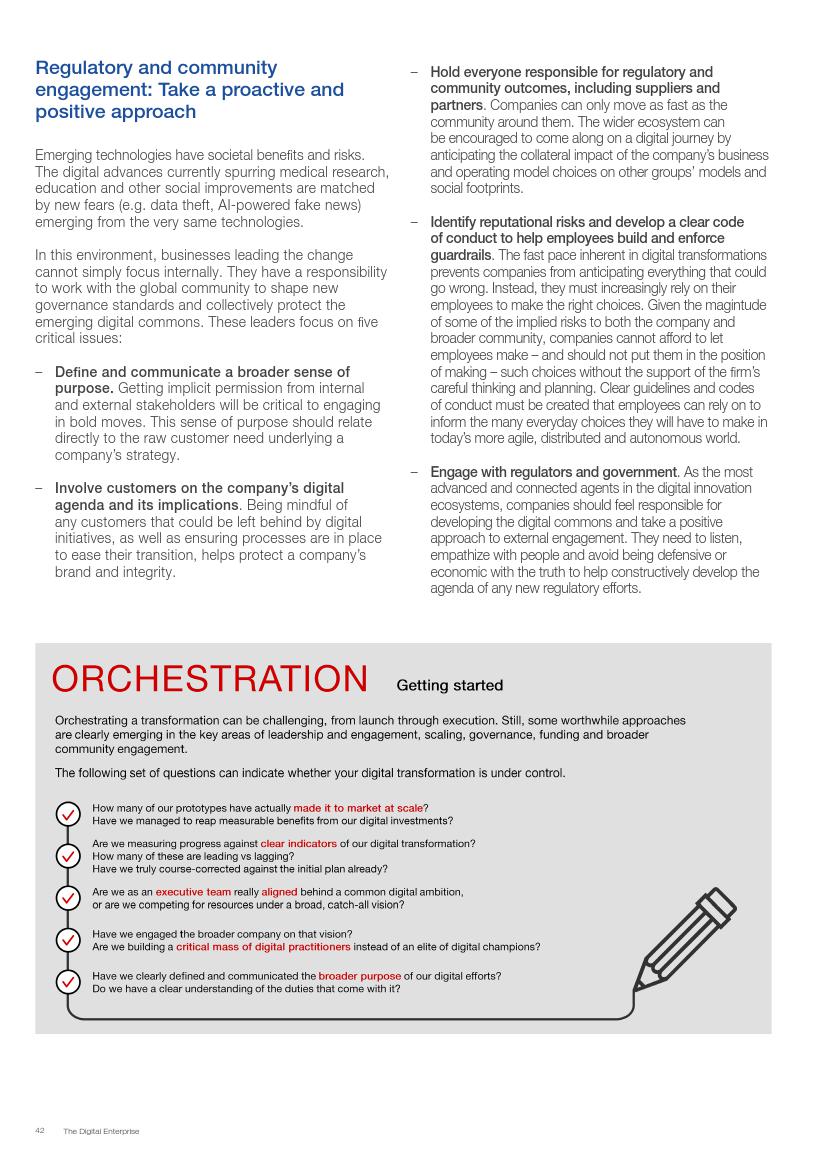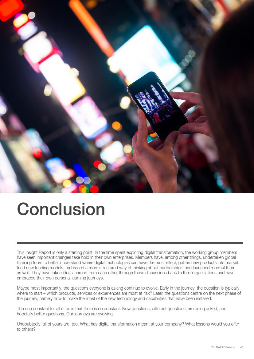 成功的企业了解并接受在不确定环境中能够发挥作用的数字化战略,通过“测试和学习”的思维模式取得成功。相对于卖产品而言,成功的企业更关注客户需求,通过匹配需求与迭代,不断更新产品或服务,来更好地满足客户需求。与此同时,这些企业不断地投资、开发能够帮助他们实现数字化目标的系统、技术和人才。他们也高度关注实施过程,以确保成功的试验结果能够规模化。