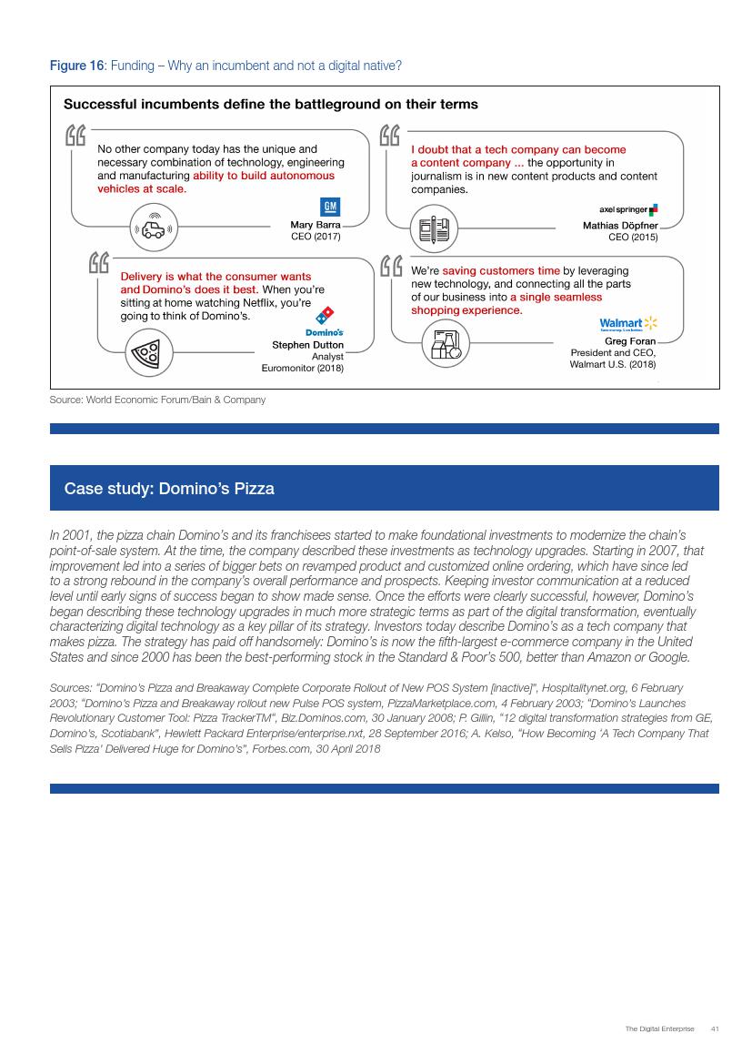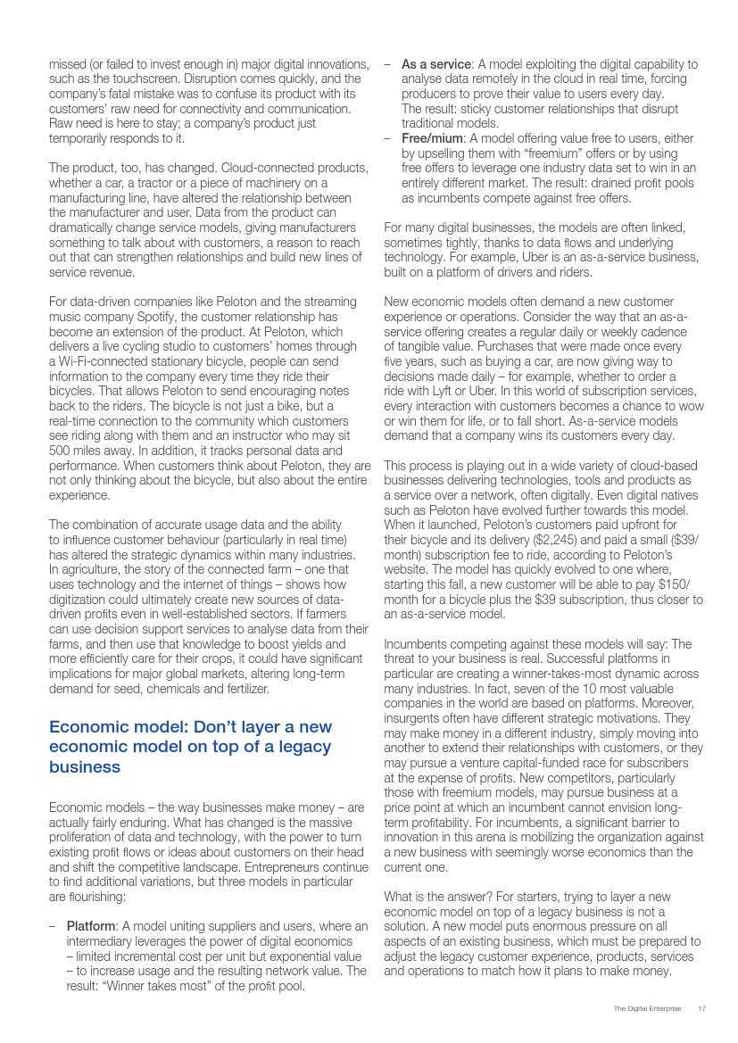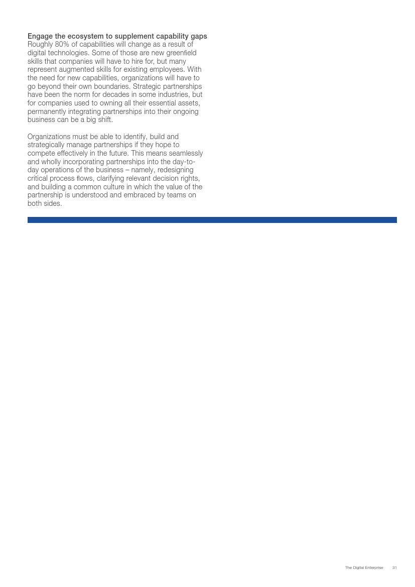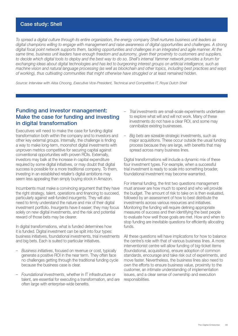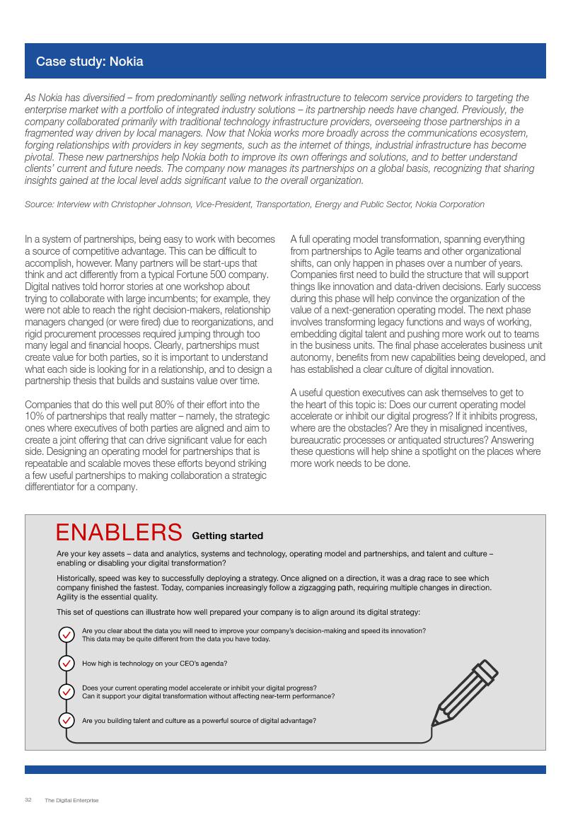成功的企业了解并接受在不确定环境中能够发挥作用的数字化战略,通过“测试和学习”的思维模式取得成功。相对于卖产品而言,成功的企业更关注客户需求,通过匹配需求与迭代,不断更新产品或服务,来更好地满足客户需求。与此同时,这些企业不断地投资、开发能够帮助他们实现数字化目标的系统、技术和人才。他们也高度关注实施过程,以确保成功的试验结果能够规模化。