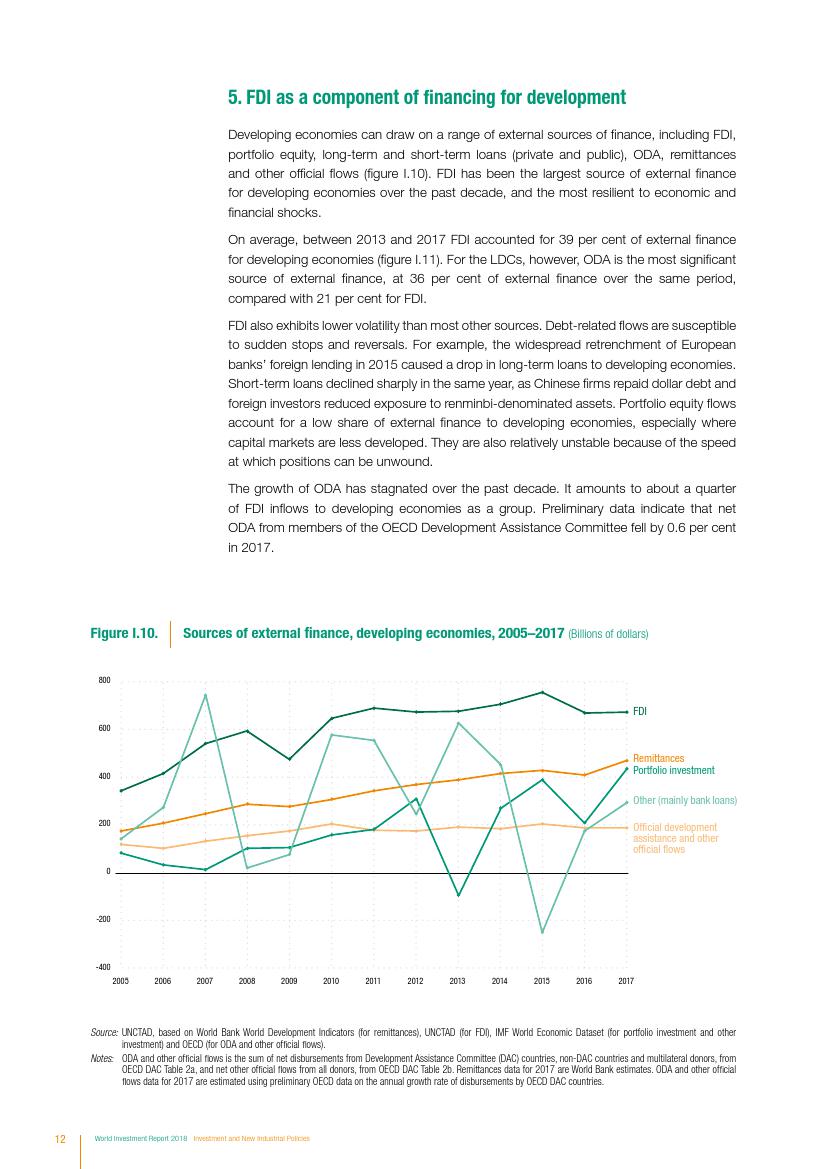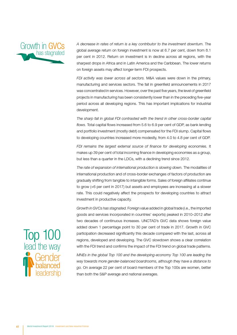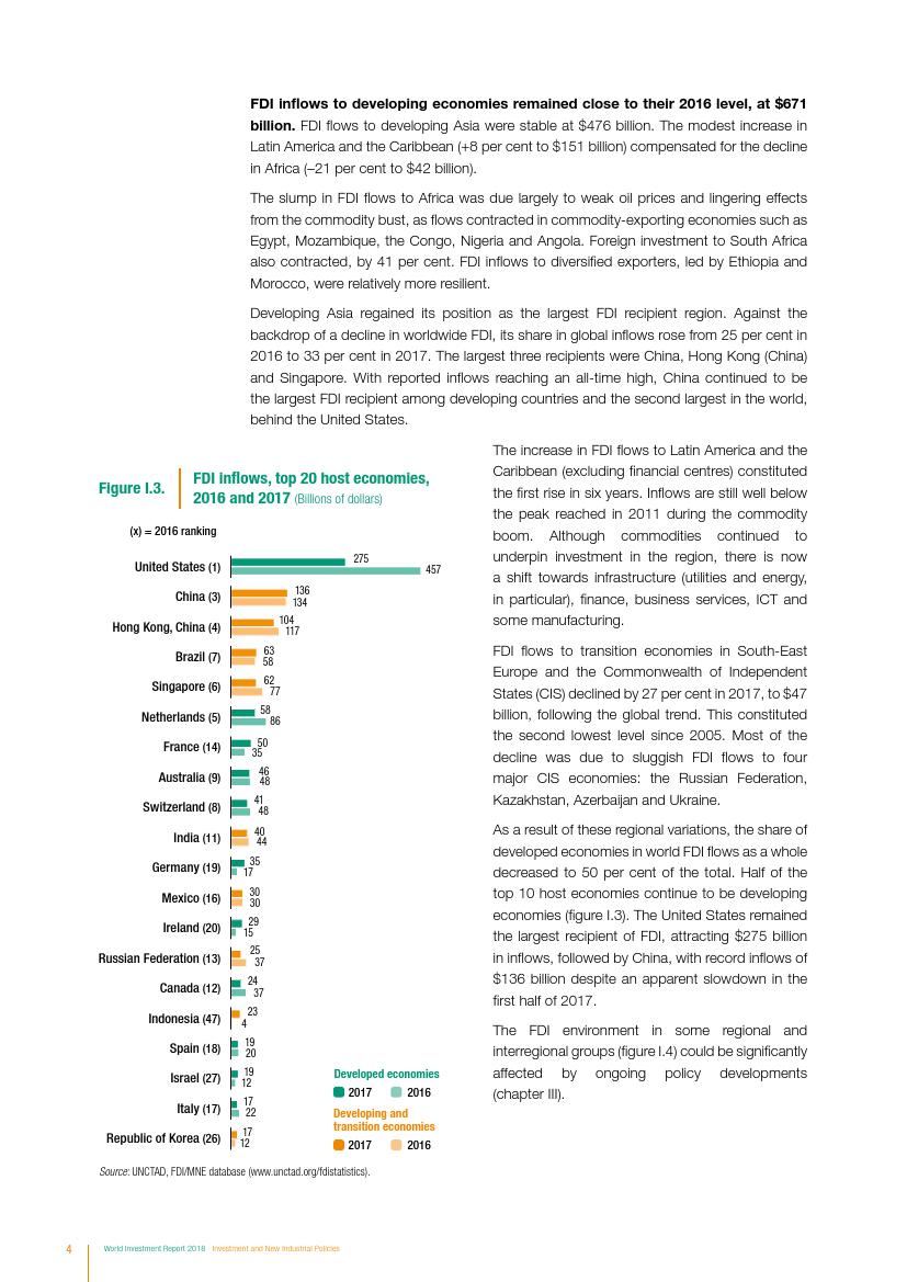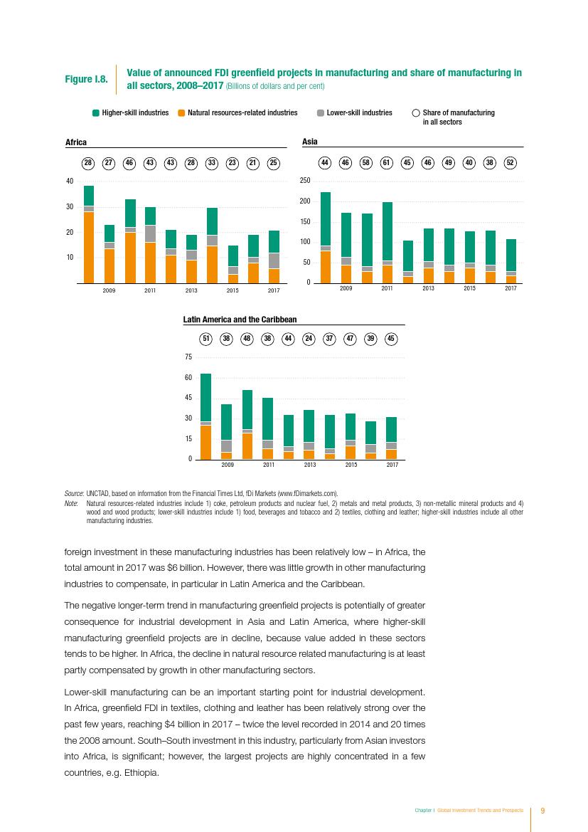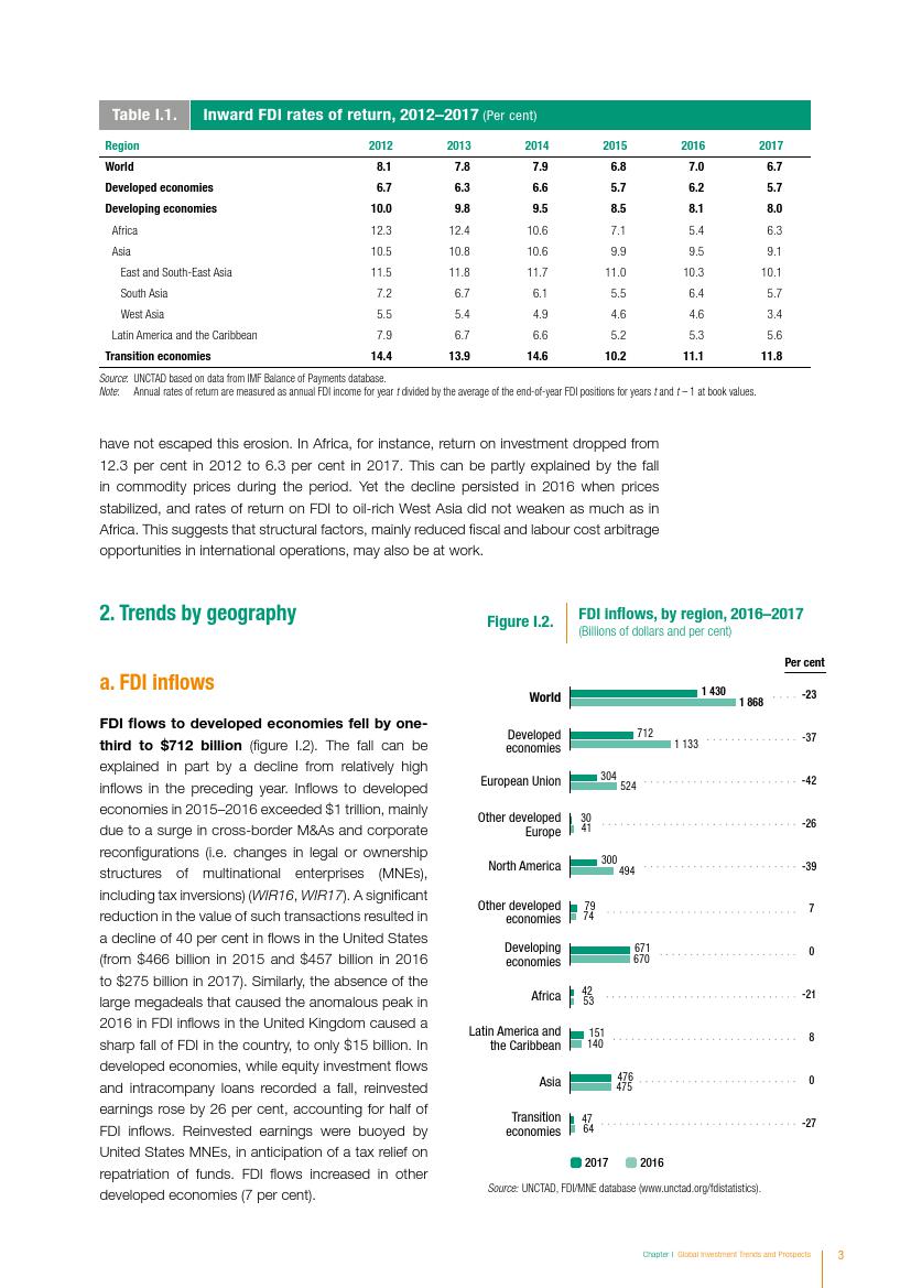 全球投资回报率下降是导致投资低迷的原因之一。 2017年外商投资的全球平均回报率为6.7%,低于2012年的8.1%。其中,非洲、拉美及加勒比地区的投资回报率降幅最大。报告指出,外国资产回报率下降可能会影响外国投资的长期前景。