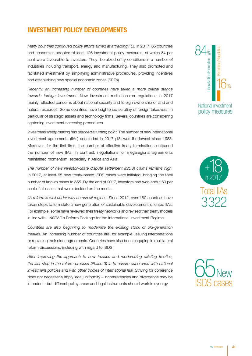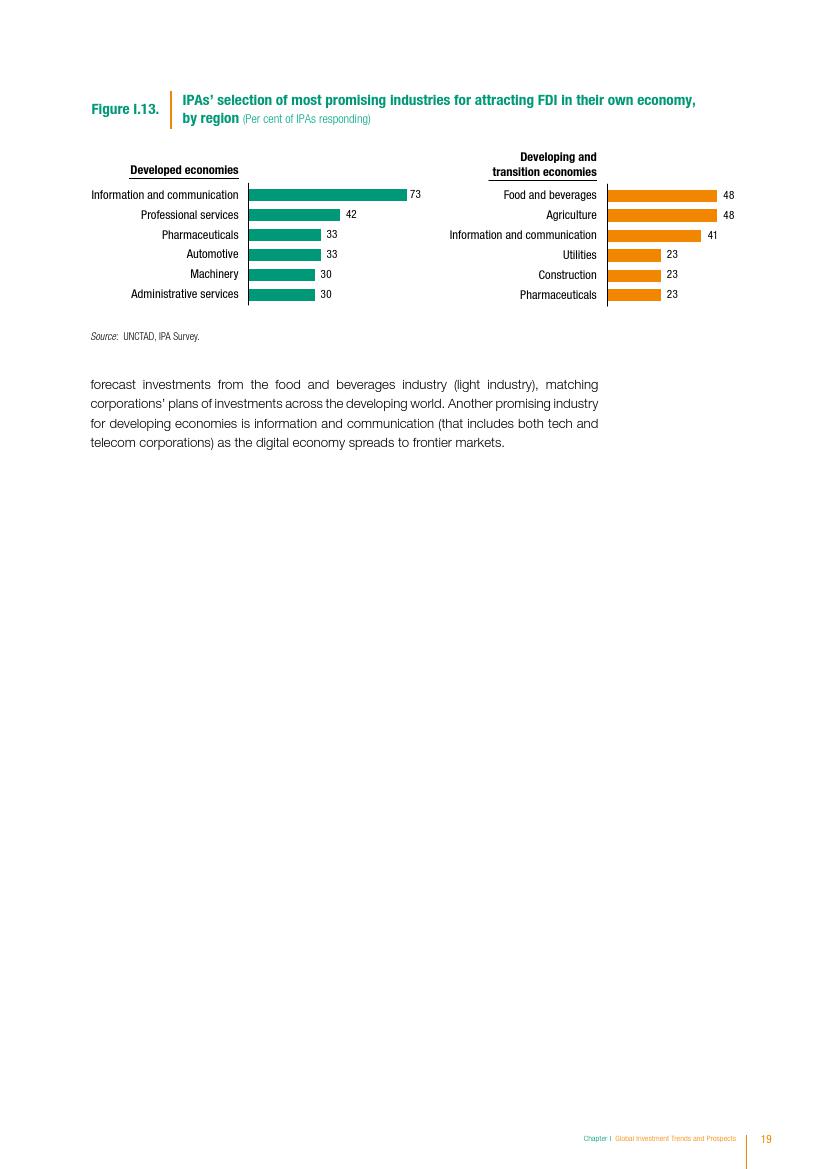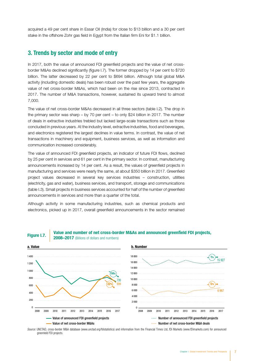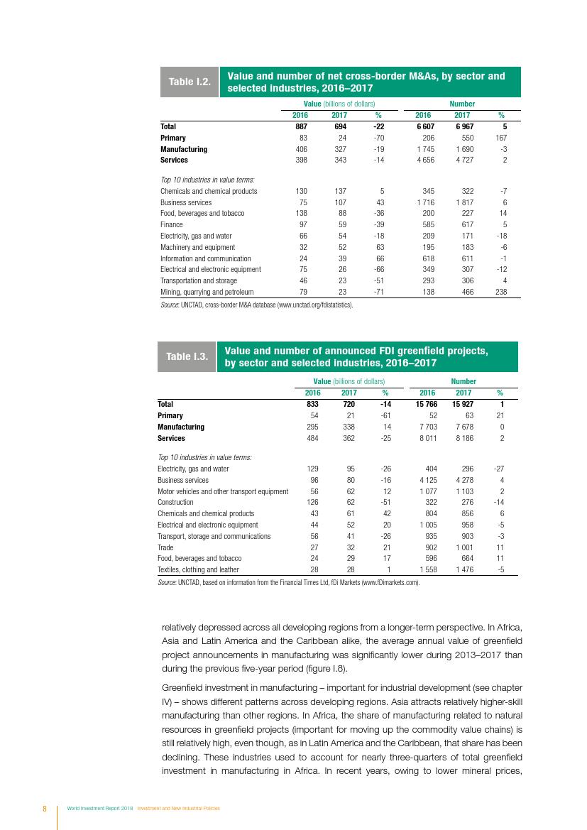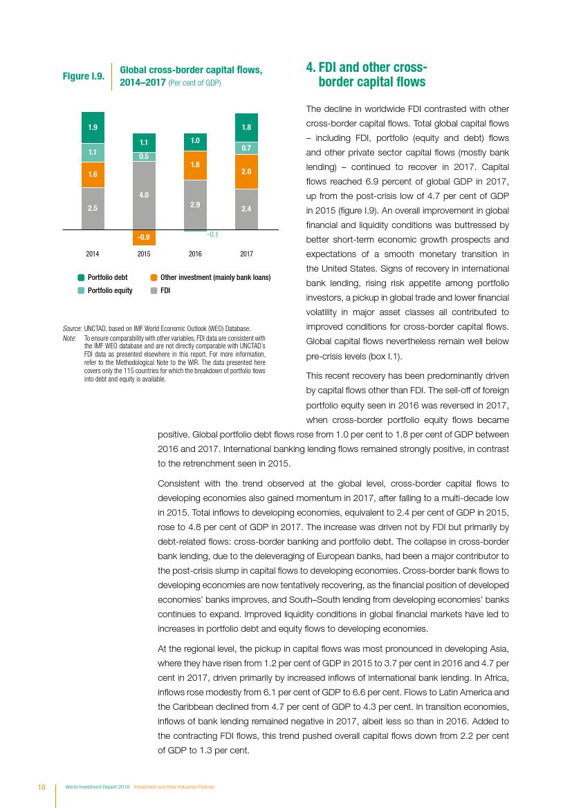 全球投资回报率下降是导致投资低迷的原因之一。 2017年外商投资的全球平均回报率为6.7%,低于2012年的8.1%。其中,非洲、拉美及加勒比地区的投资回报率降幅最大。报告指出,外国资产回报率下降可能会影响外国投资的长期前景。