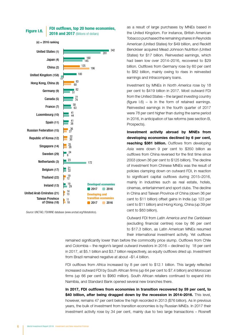 根据贸易和发展组织的报告,中国仍是发展中国家中最大的吸收外资国和对外投资国。2017年中国吸收的外资在全球排名中位居第二,仅次于美国。与此同时,2017年中国对外投资全球排名第三,在美国和日本之后。