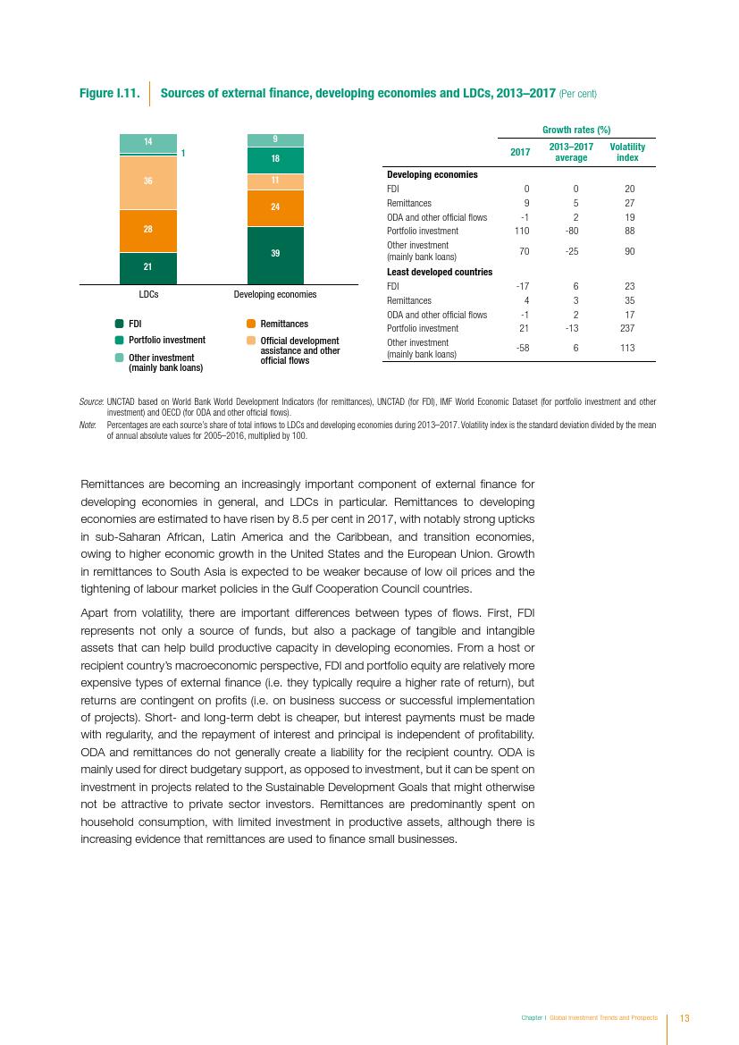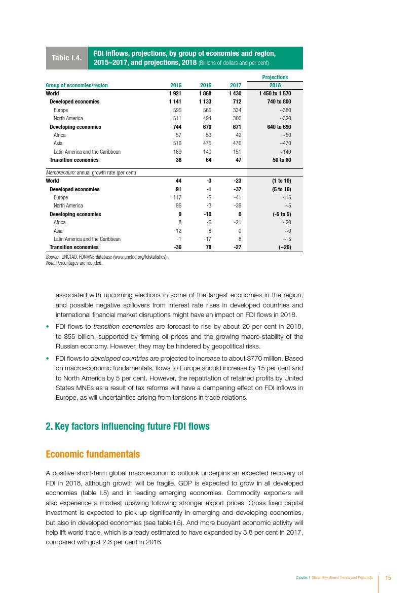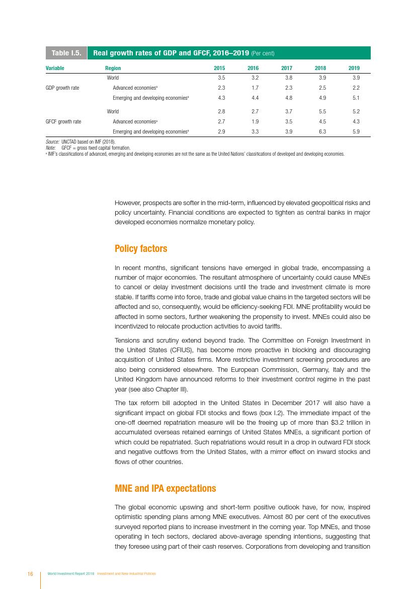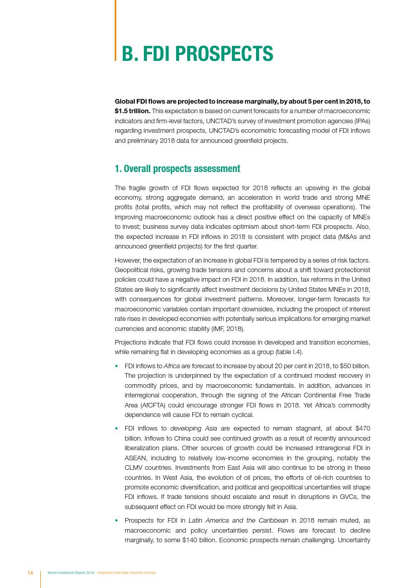 展望2018年的投资前景,联合国贸易和发展组织投资企业司司长詹晓宁表示,2018年全球国际投资预计将出现增长,但增长势头将十分脆弱。全球外国直接投资预期将增长5%左右,最多不超过10%,总量仍将低于过去10年的平均水平。
