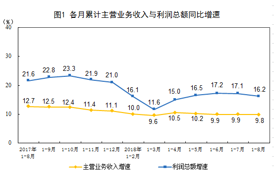 1-8月份,全国规模以上工业企业实现利润总额44248.7亿元,同比增长16.2%(按可比口径计算,考虑统计制度规定的口径调整、统计执法增强、剔除重复数据、企业改革剥离等因素影响,详见附注二),增速比1-7月份放缓0.9个百分点。