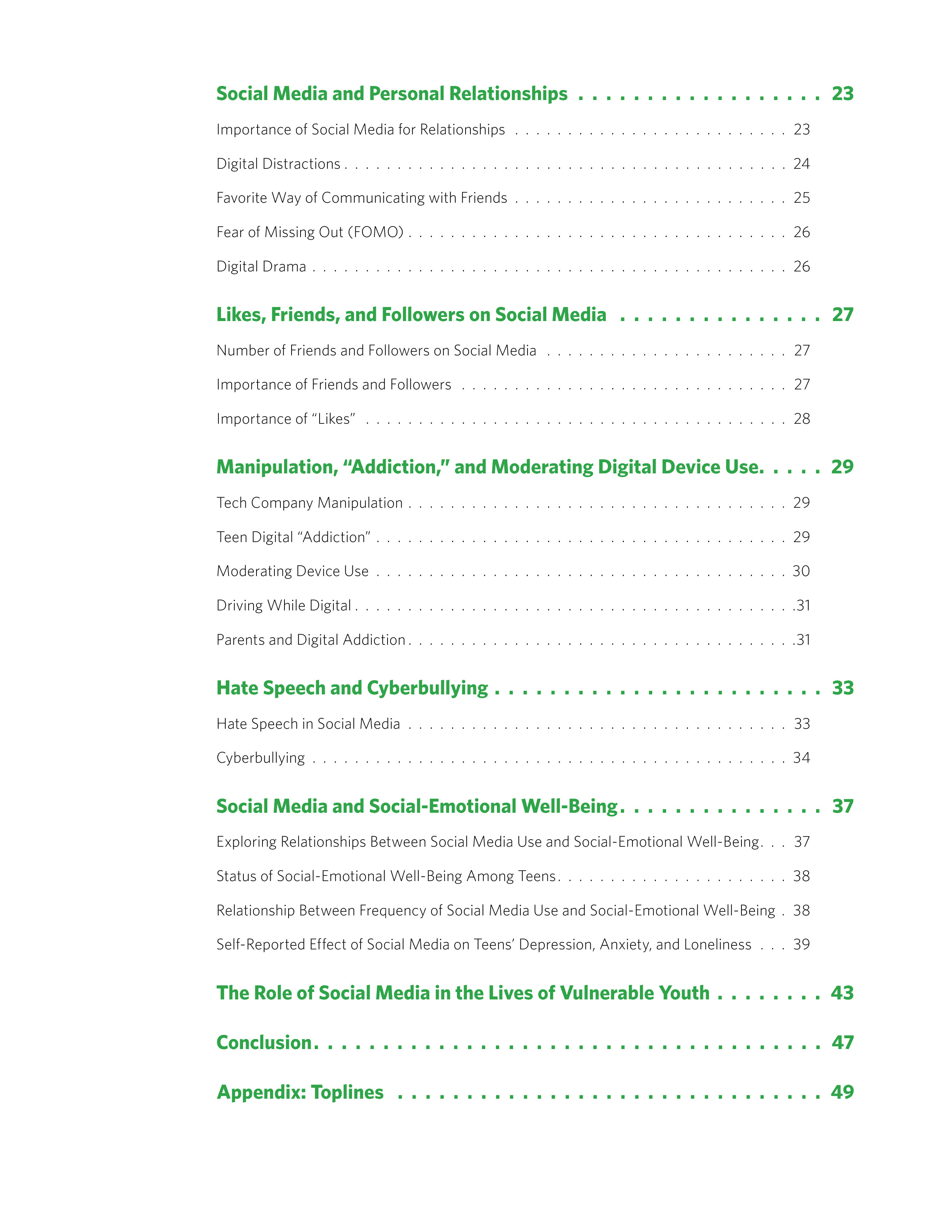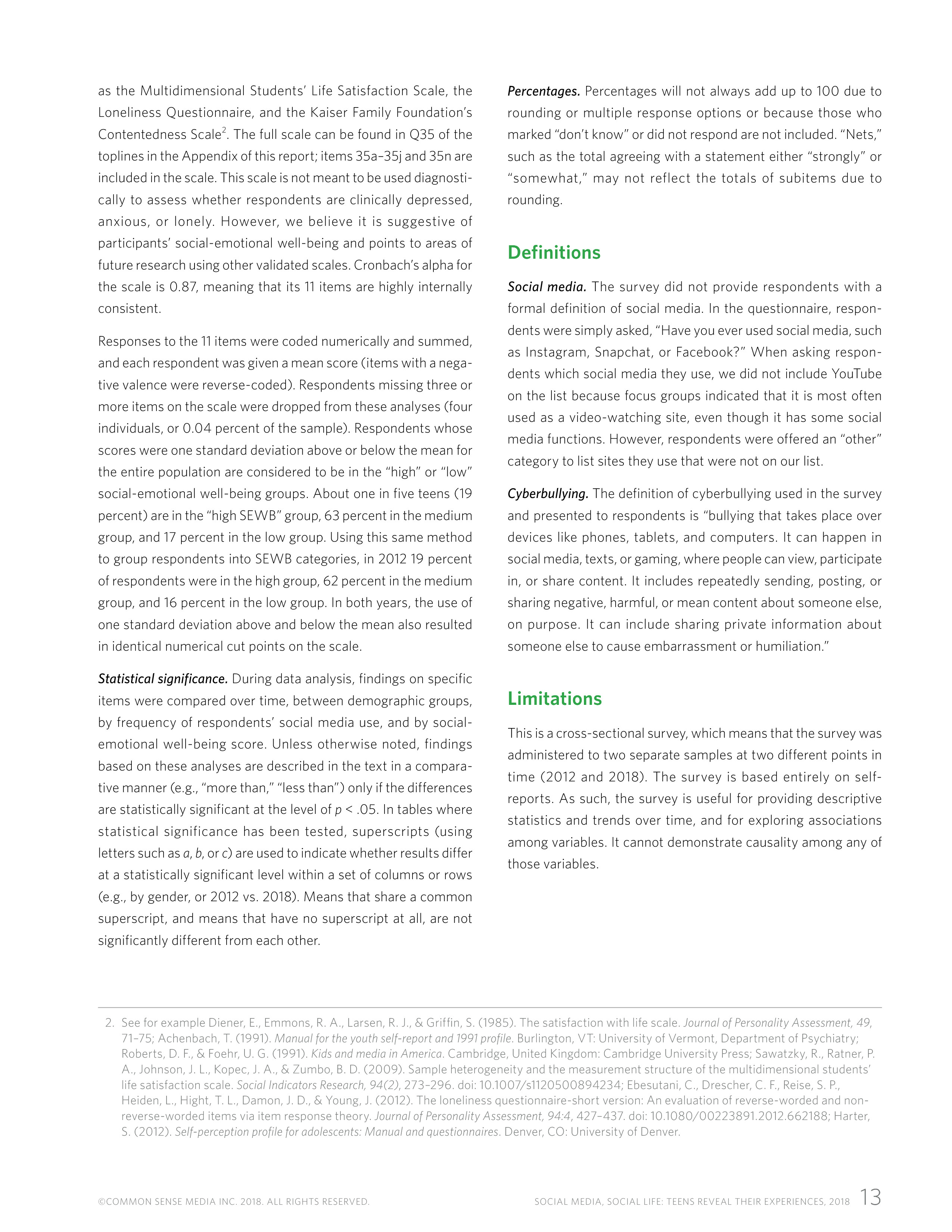 社交媒体对青少年的影响很大,无论是正面还是负面。调查包括幸福、沮丧、固定、自信、自尊和亲子关系等社交情感概念(SEWB)。约1/5的青少年处于高SEWB组群(19%),63%处于中等,17%处于较低组群。