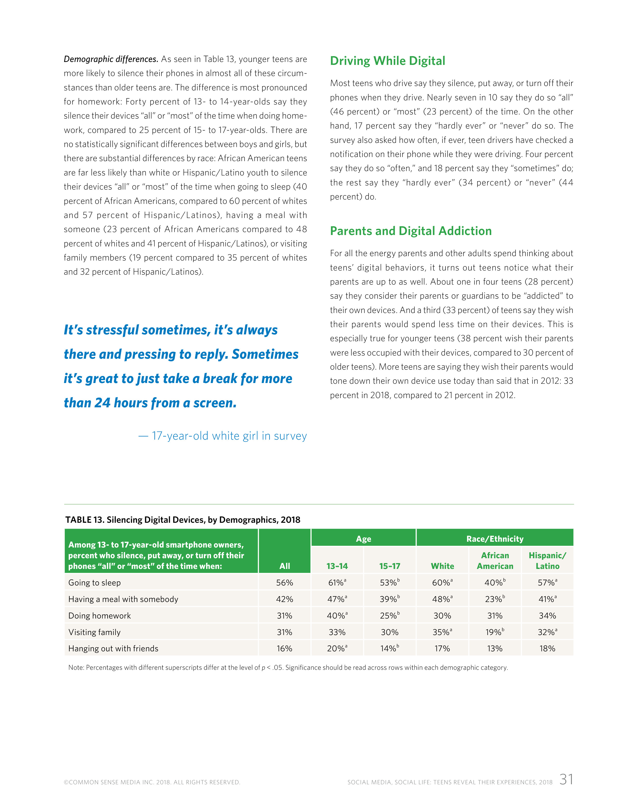 在自我调节设备使用量时,青少年非常复杂。56%的青少年在睡觉时关手机或静音,42%的人在吃饭时这么做,31%的青少年在写作业时这么做。很多人在写作业(37%)、吃饭(31%)或睡觉(26%)时也把手机放在身边。