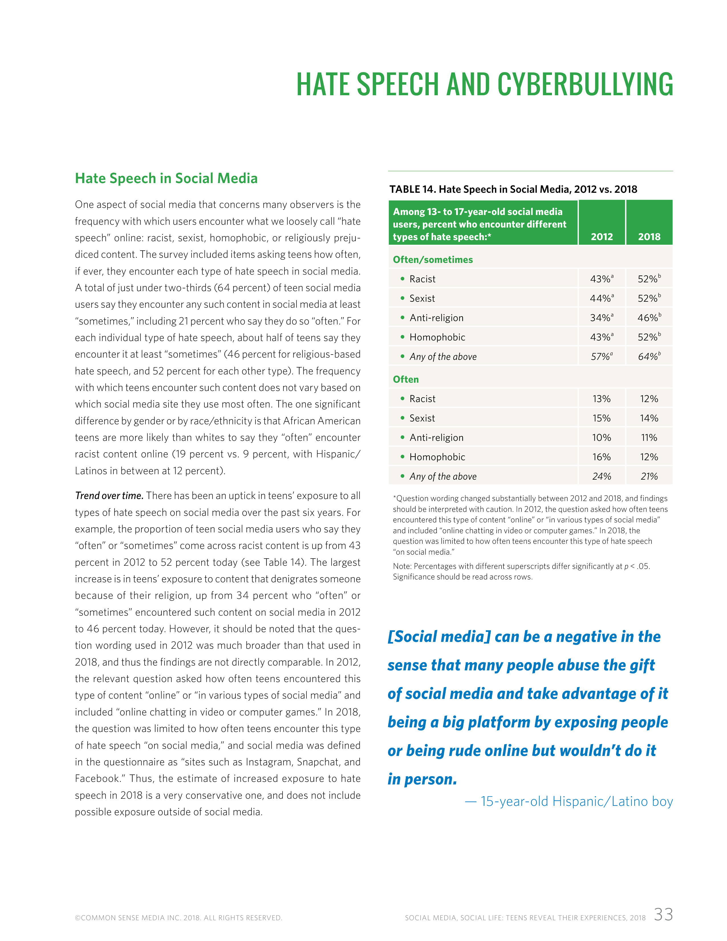 青少年在社交媒体上暴露在种族主义、性别歧视和同性恋的情况从8%增长到12%。