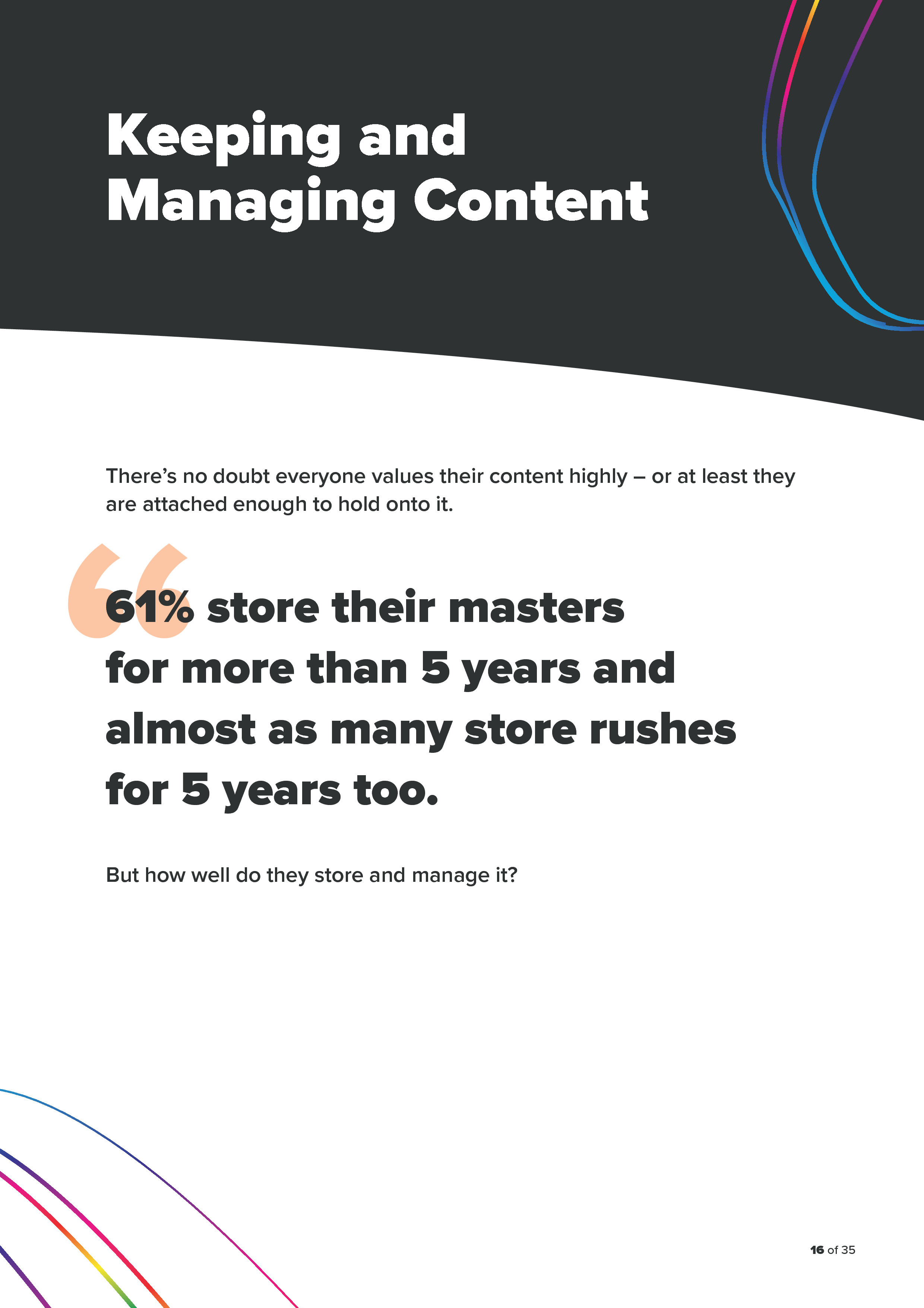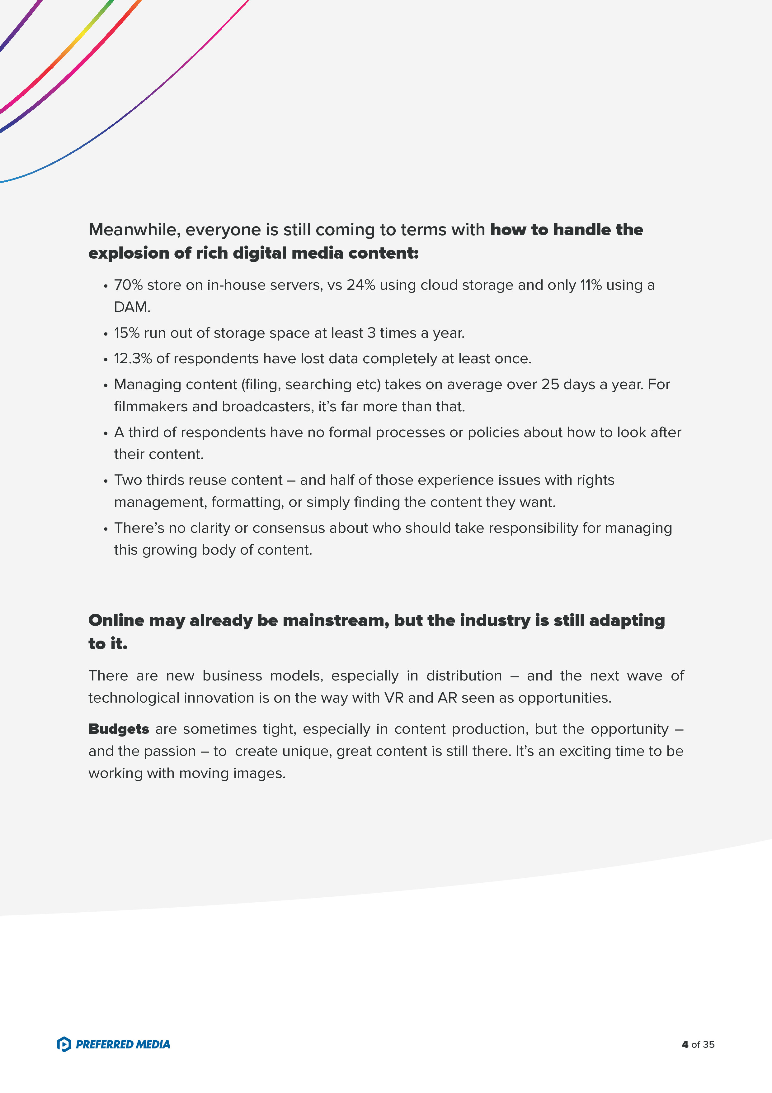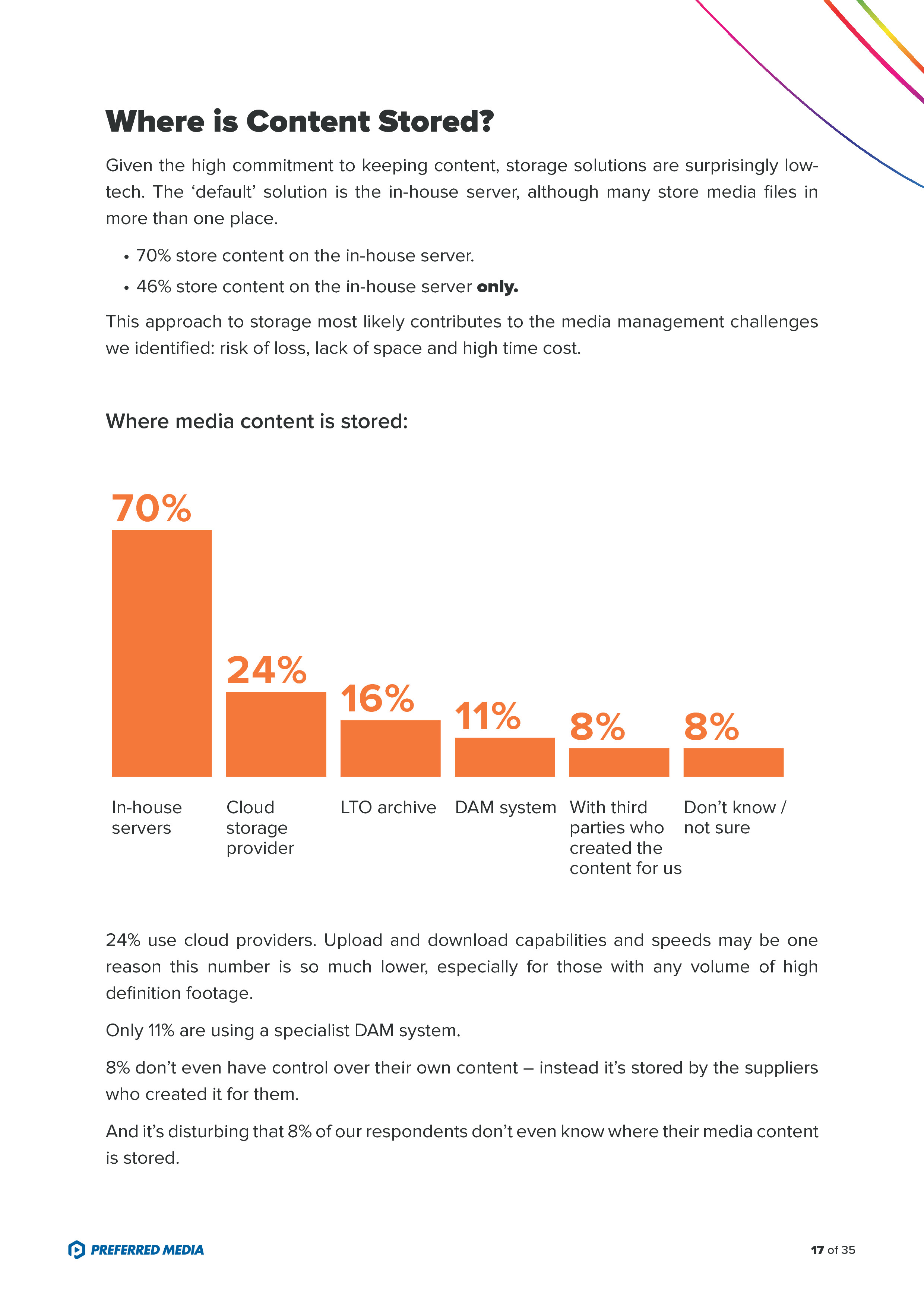 - 70%的受访者利用组织内服务器存储富媒体内容,24%用云存储,只有11%用DAM;